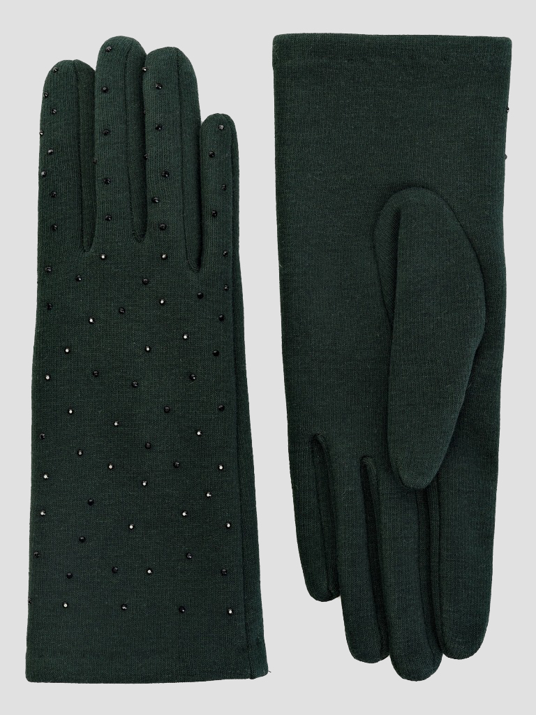 Модель выполнена с тонкой и теплой подкладкой из флиса. Отделка - лицевая сторона украшена россыпью страз черного цвета. Длина манжеты от нижней точки большого пальца до края перчатки - 6 см. Длина пальцев - средняя.