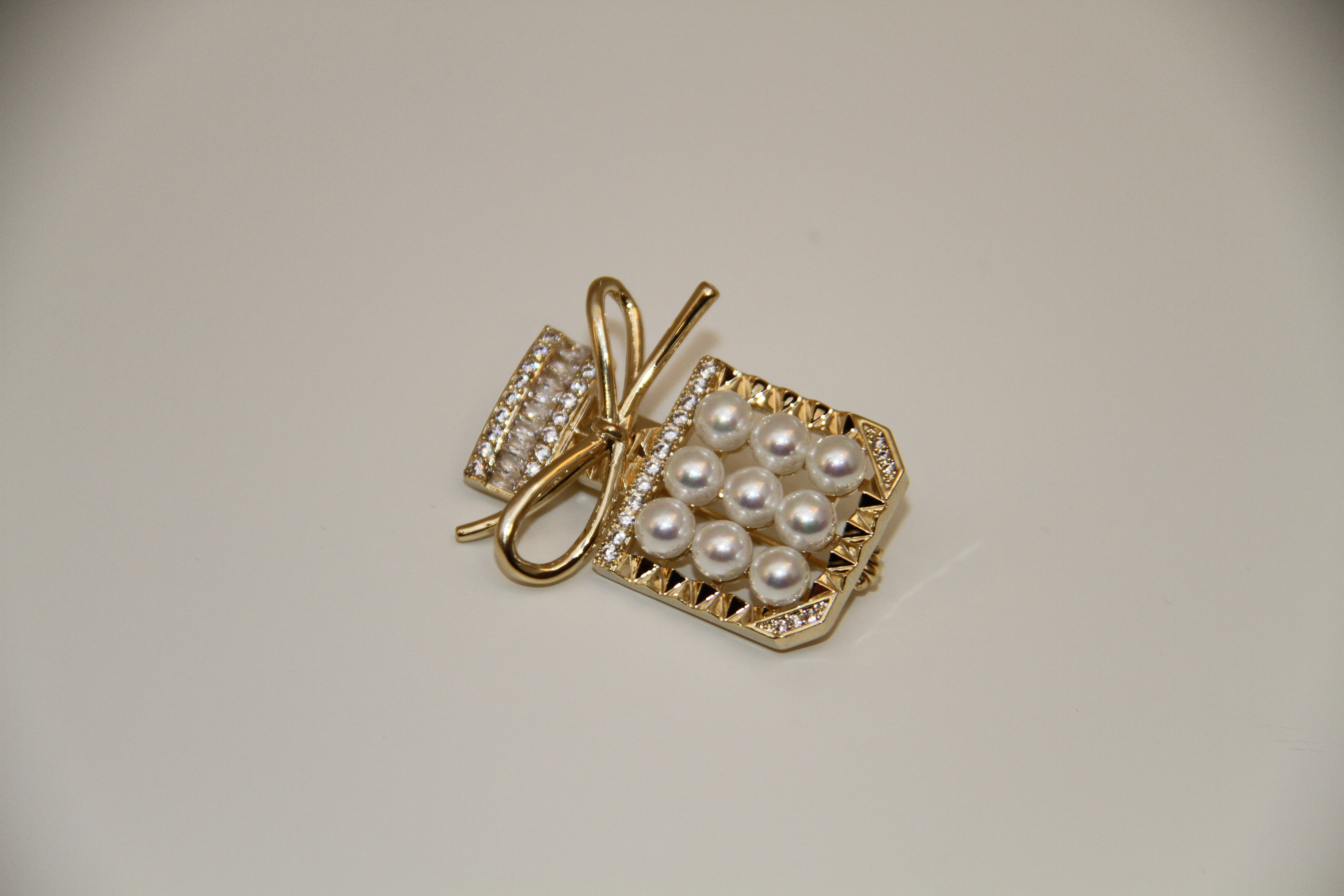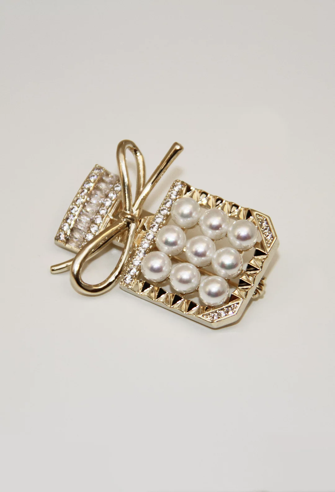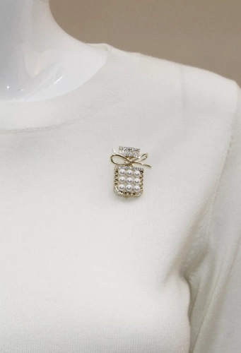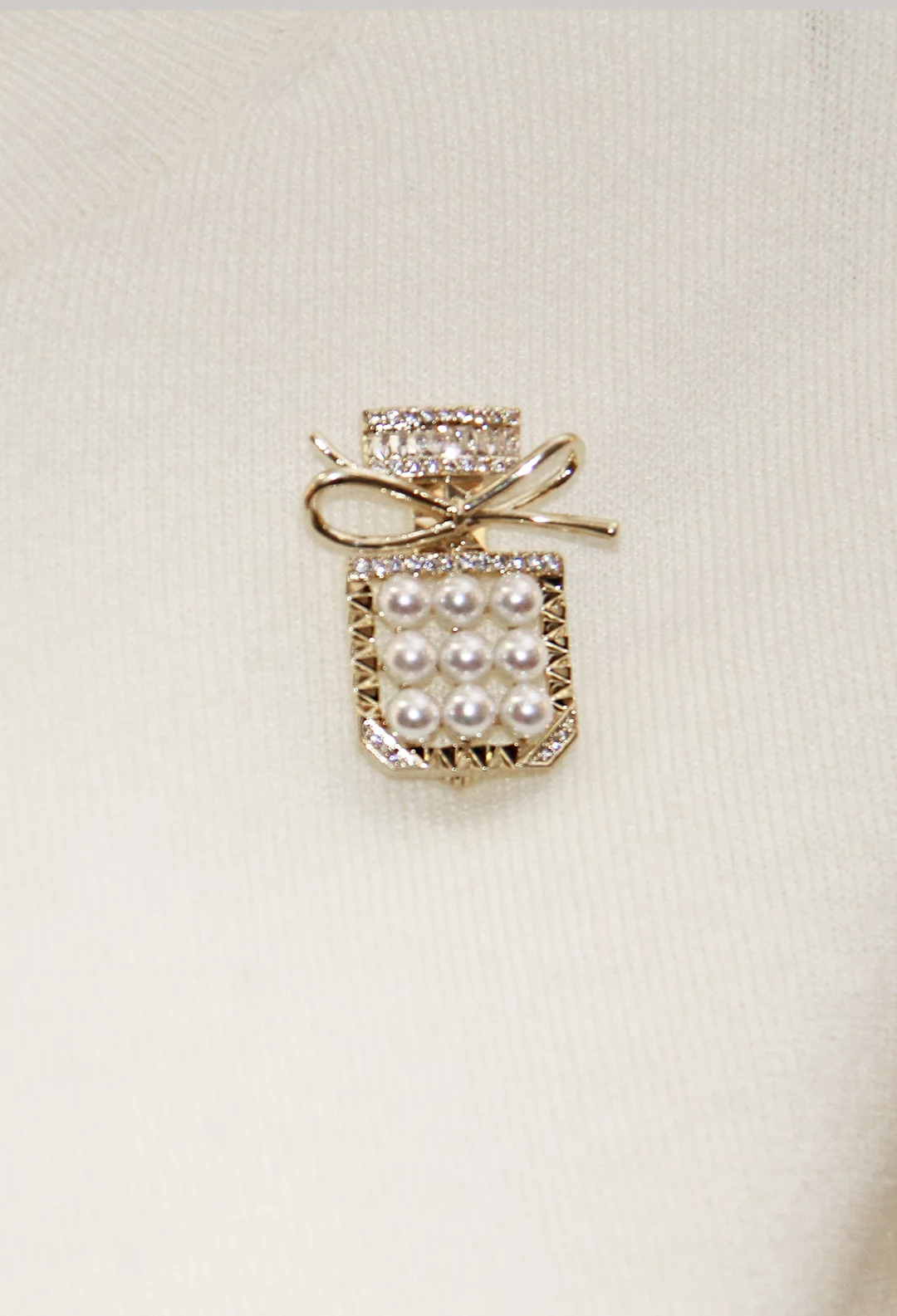 Оригинальная брошь в виде флакона с бантиком. Выполнена с использованием искуственного жемчуга.