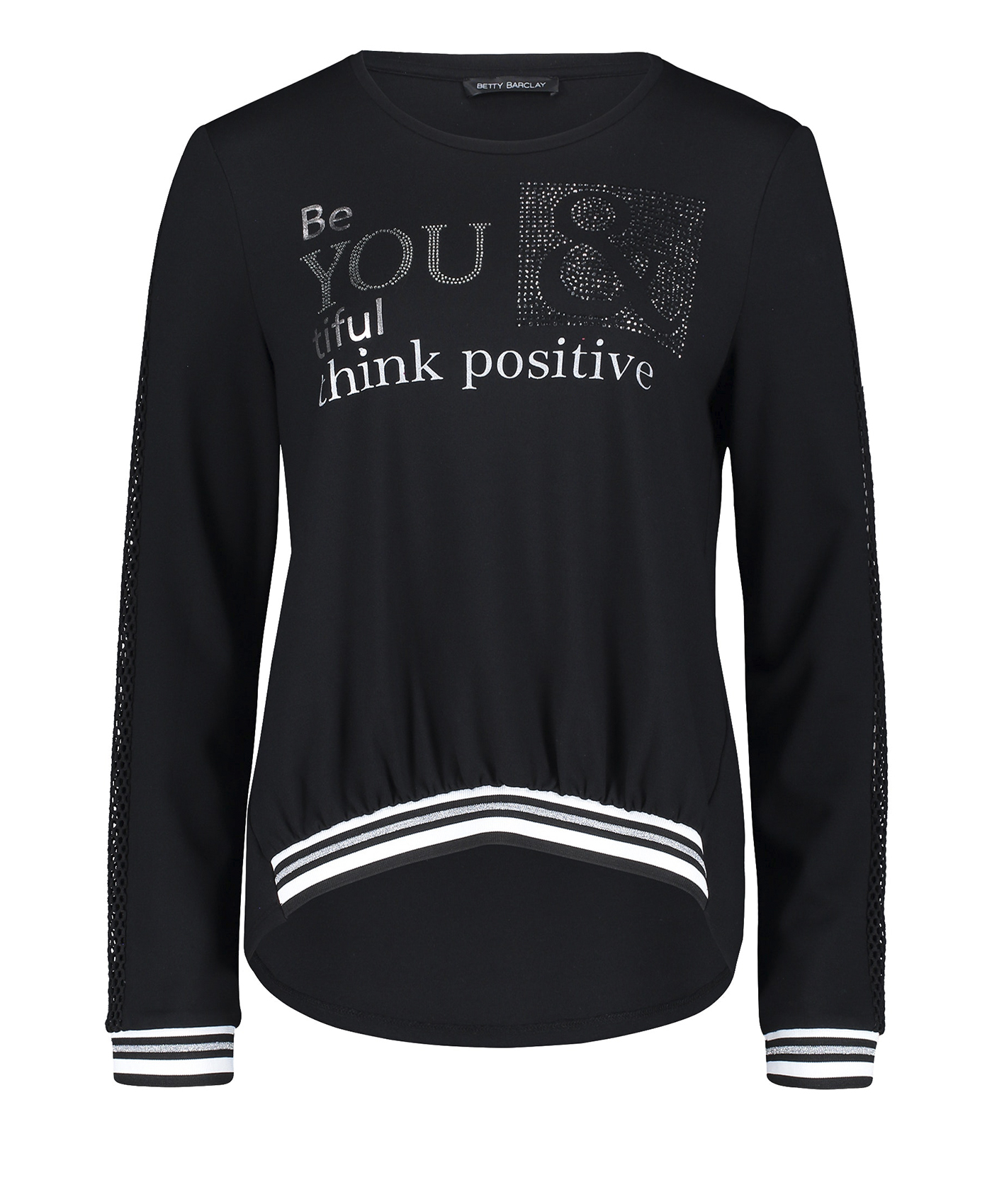 Джемпер прямого покроя. Круглый вырез горловины, удлиненная спинка, длинные рукава на манжетах. Материал из вискозной смеси обеспечивает комфорт. Блестящая отделка вдоль рукавов и декор стразами придают образу гламур. Отличный вариант верха для стильного повседневного образа!