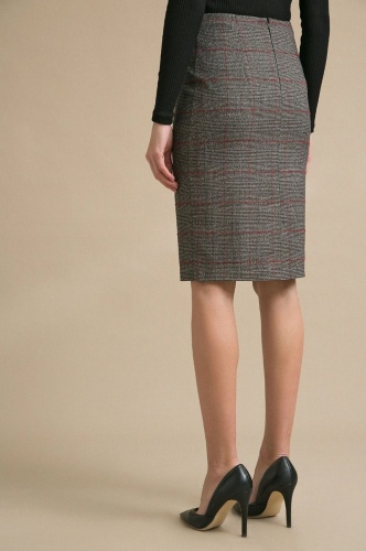 Серая юбка в клетку. Модель прямого кроя, выполнена без пояса, застегивается сзади на молнию в серединном шве. Лаконичная, простая модель в духе минимализма. Подойдет для повседневной жизни и деловых встреч.