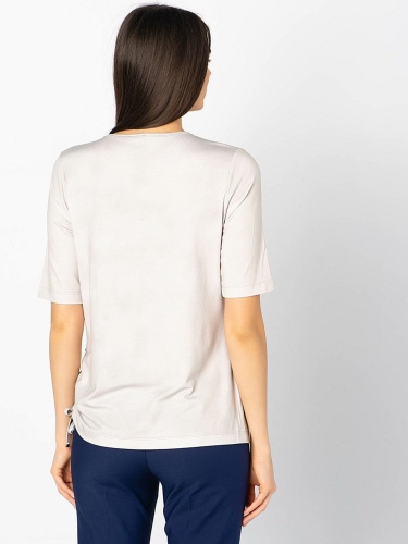 Мечтаете о тропиках? Тогда эта футболка - именно то, что нужно! Приятная расцветка и трендовый принт с изображением экзотических цветов перенесет вас в теплые края. Мягкий материал из смеси вискозы и эластана гарантирует отличную посадку, а рукав 1/2 придает образу легкость и непринужденность. Футболка будет замечательным компаньоном как в брючном, так и в юбочном комплекте.