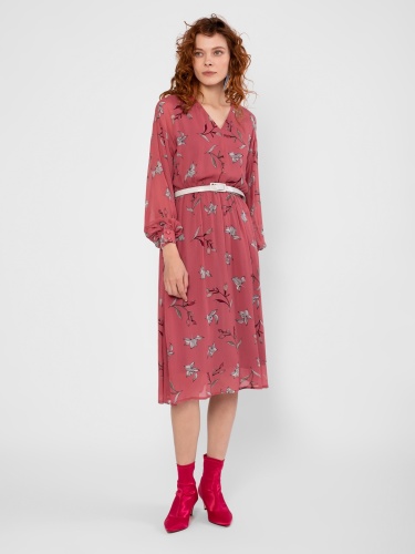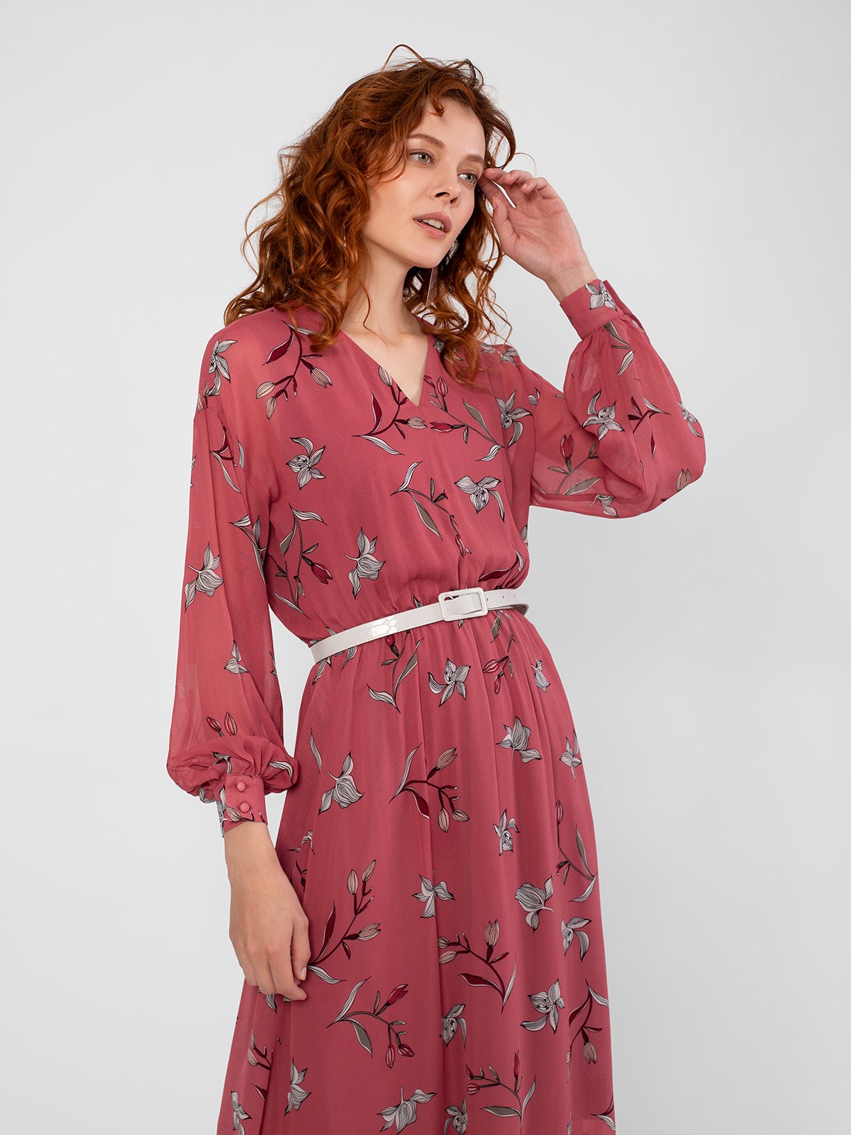 Платье из вискозы полуприлегающего силуэта с v-образным вырезом, спущенным плечом и обьемным рукавом на манжете. На талии резинка. В комплект входит узкий съемный ремень из экокожи с металлической пряжкой.