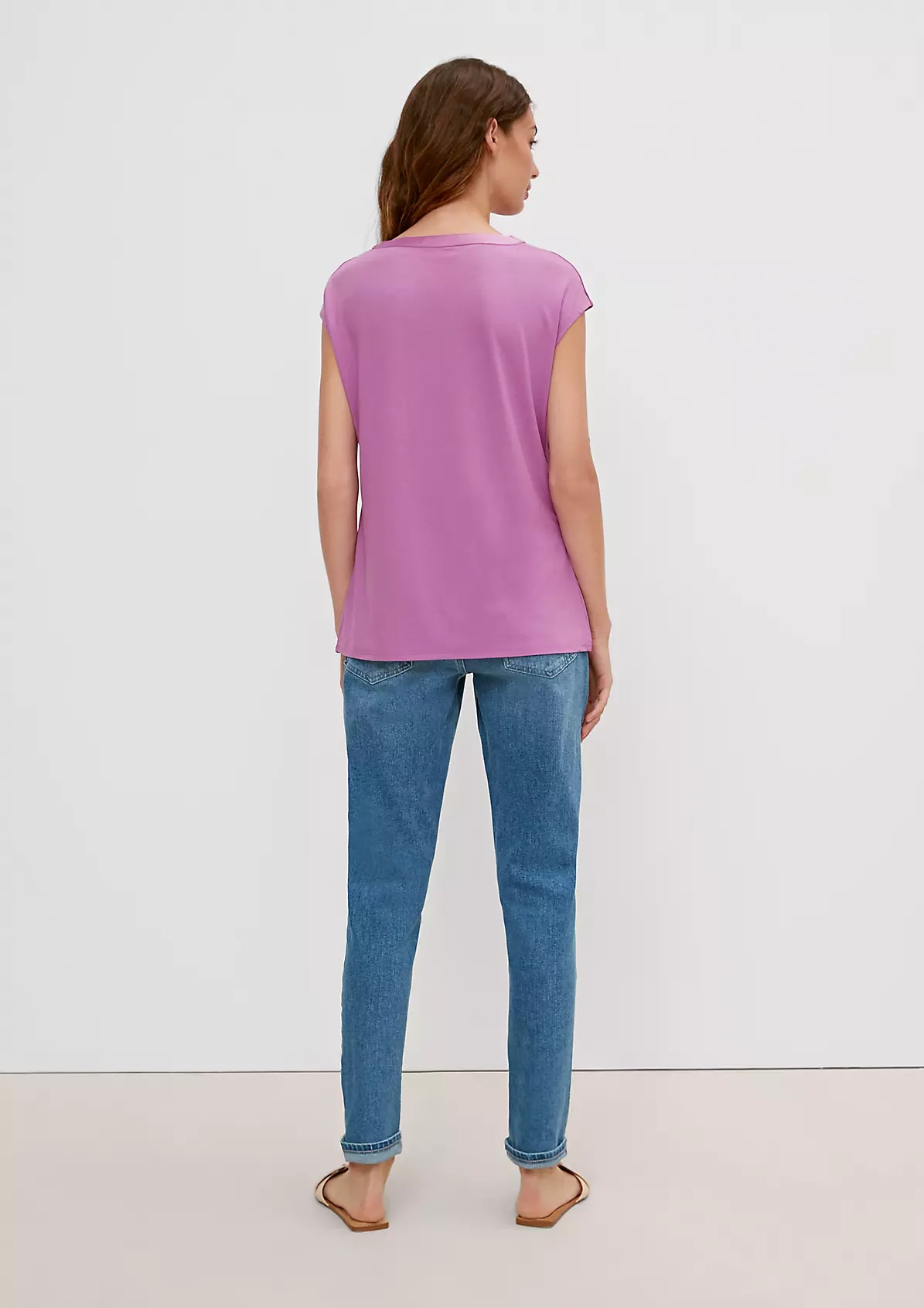 На сайте указаны российские размеры. Тонкая однотонная футболка из вискозы. Длина спины: 64 см в размере 42.