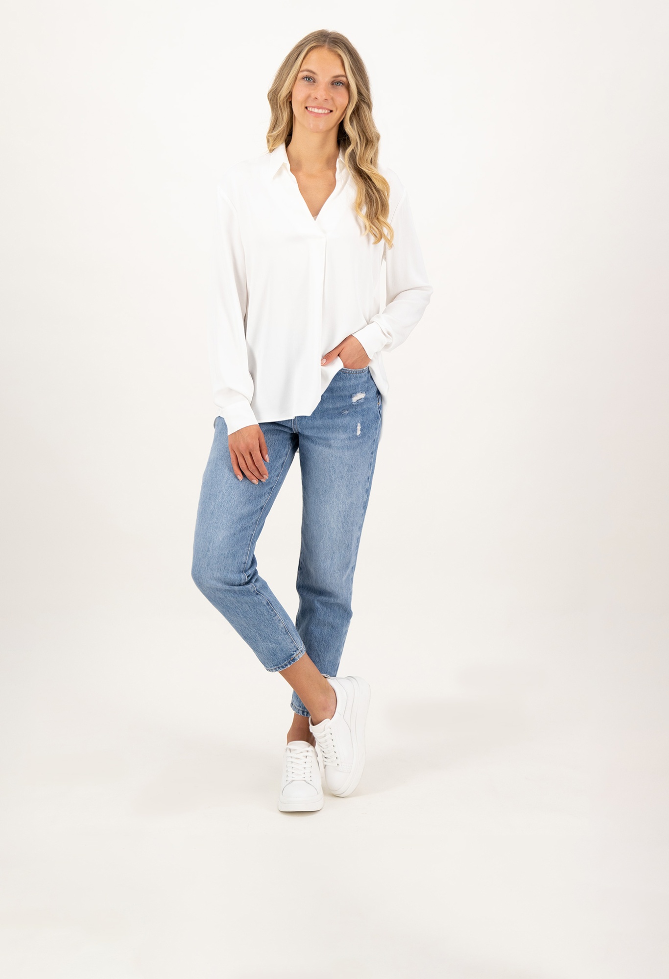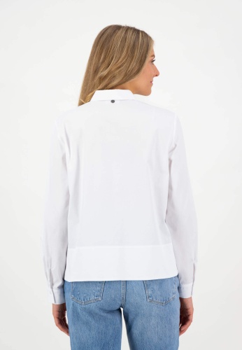На сайте указаны российские размеры. Белая блузка с длинными рукавами и планкой на потайных пуговицах. Эта блузка имеет спортивный вид, современный и современный благодаря планке с потайными пуговицами, воротнику рубашки и разделительному шву, но и ее качество: экологически чистые материалы, произведенные в Европе. Повседневную блузу можно комбинировать несложно и универсально, поэтому она идеальна для повседневного образа. Рост модели 177 см Измерения для 46 размера: Окружность груди: 104 см Бедра: 125 см Длина спинки: 60 см. Длина рукава: 61 см.
