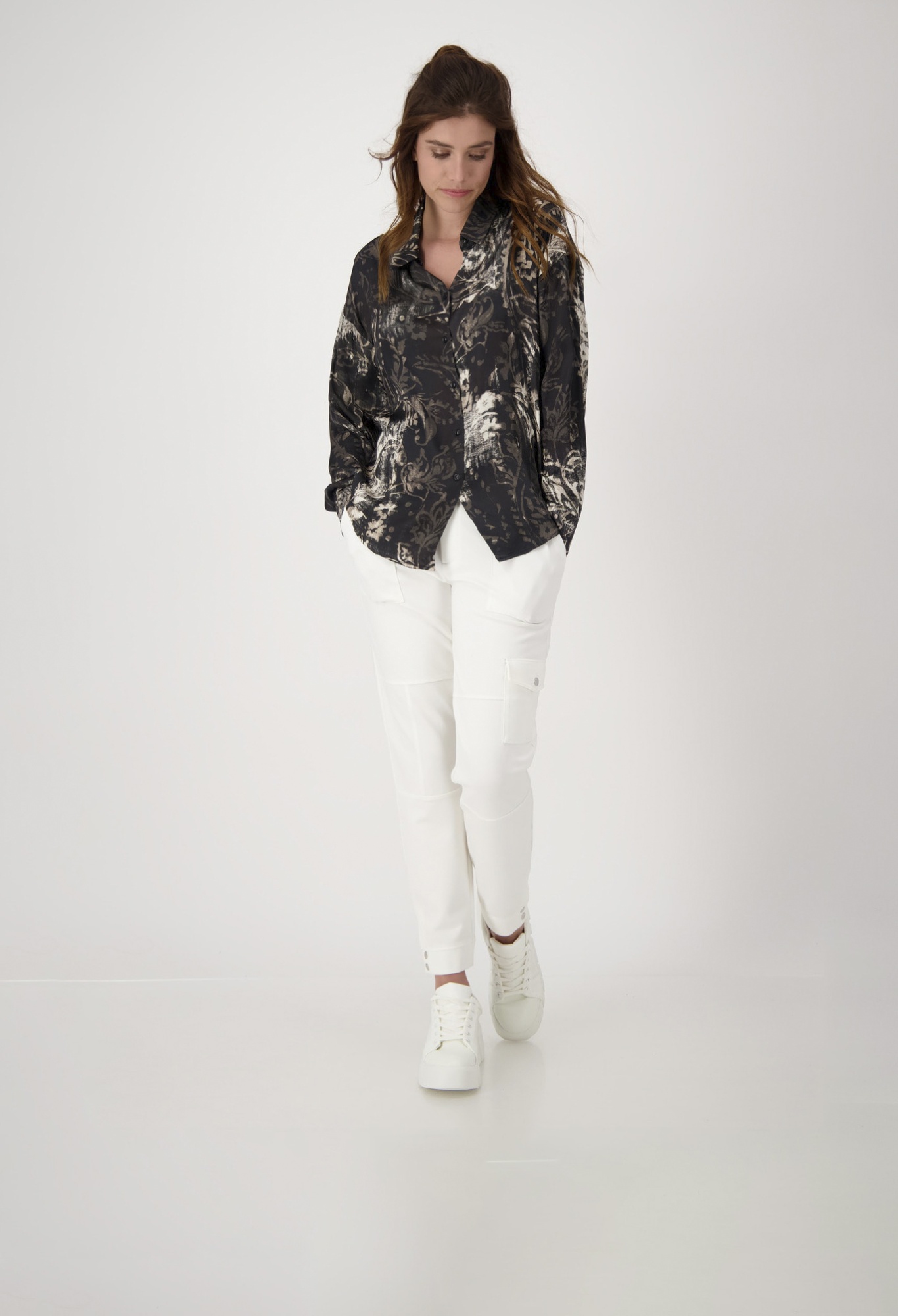 На сайте указаны российские размеры. Блузка с воротником-стойкой и принтом пейсли по всей поверхности. Рубашка-фасон с классическим рубашечным воротником, блуза-рубашка прямого кроя с удлиненной спиной и закругленным низом. Планка с пуговицами, манжеты на двух пуговицах на концах рукавов и кокетка со стильной коробчатой складкой на спине завершают дизайн изящно струящейся модели. Не отказывайтесь от эксклюзивной модели из вискозы с принтом пейсли по всей поверхности. Отлично подойдут к светлым брюкам в стиле карго с модными кроссовками. Рост модели 175 см. Длина по спинке 44 размера составляет 74 см, а по переду – 70 см.