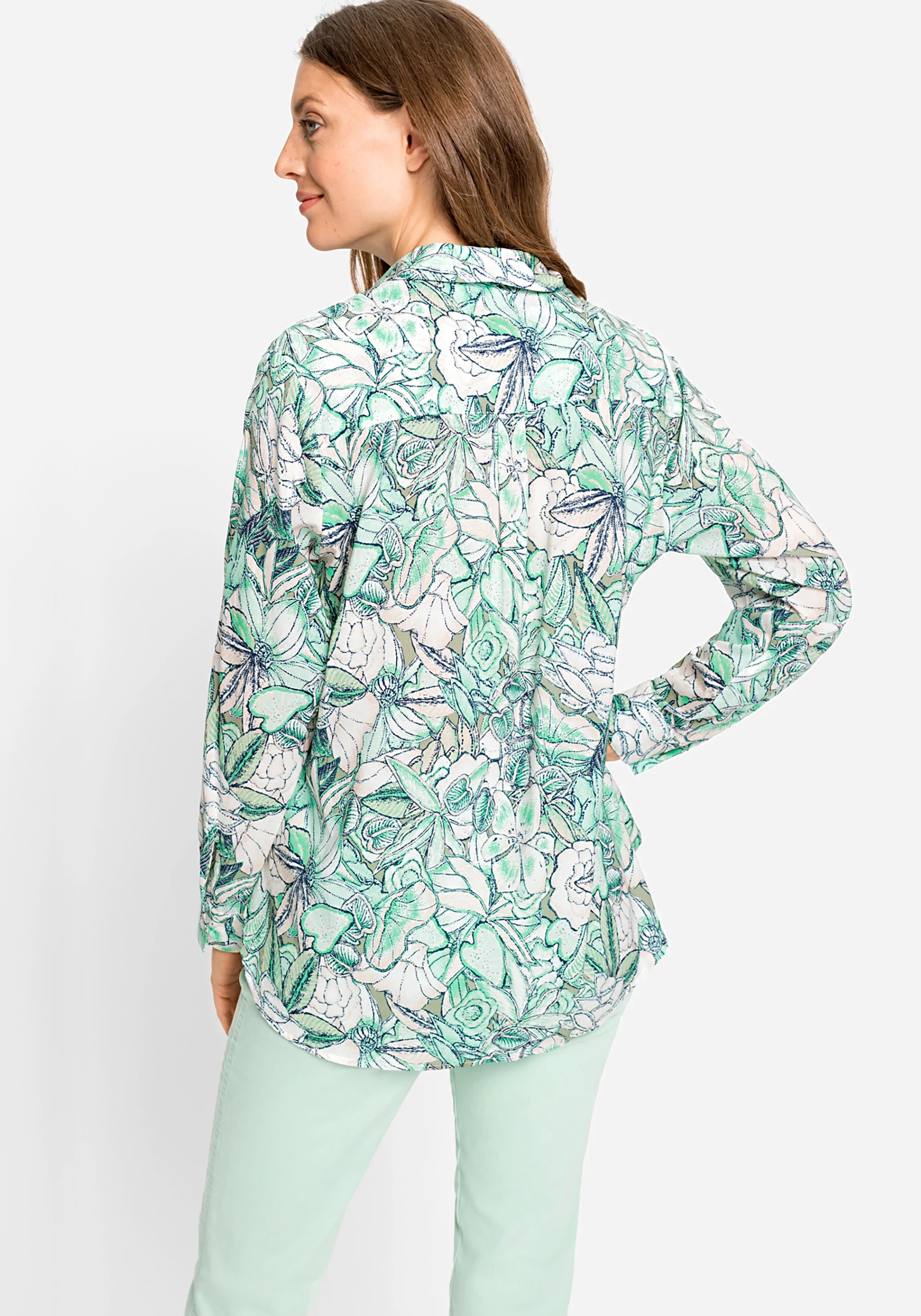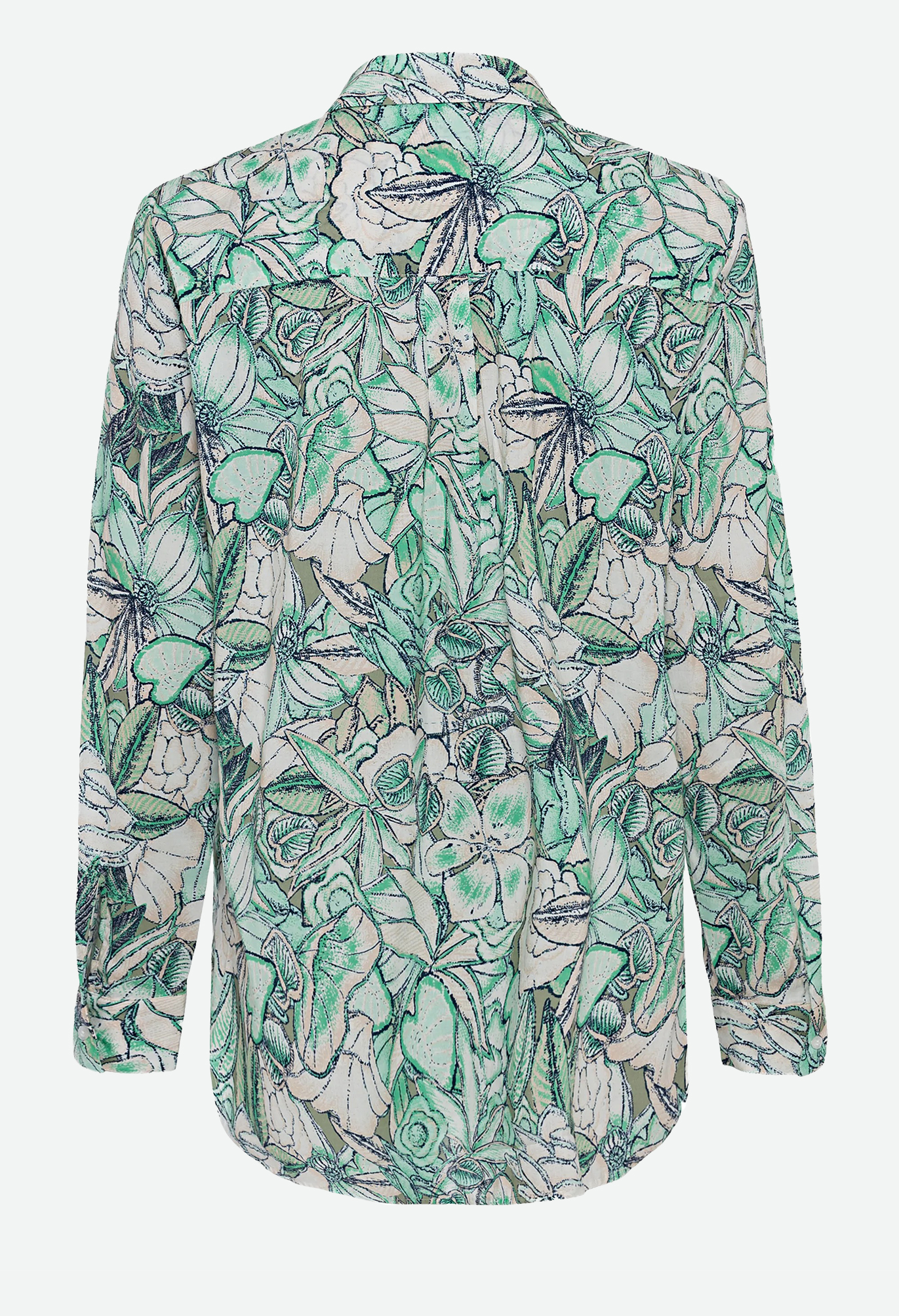 На сайте указаны Российские размеры. Блуза с цветочным принтом передает классический силуэт и утонченный стиль с воротником, сплошной планкой на пуговицах и манжетами на пуговицах. Блузка сзади немного длиннее, чем спереди.