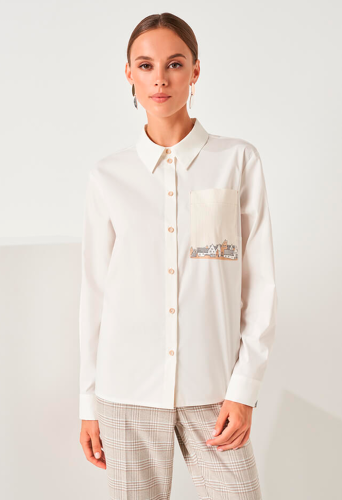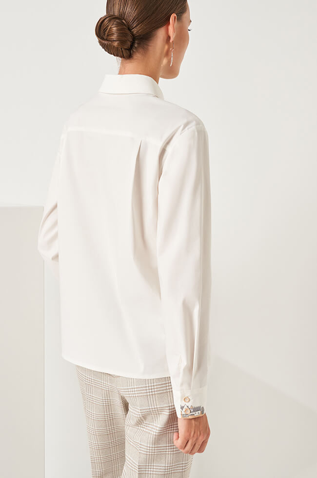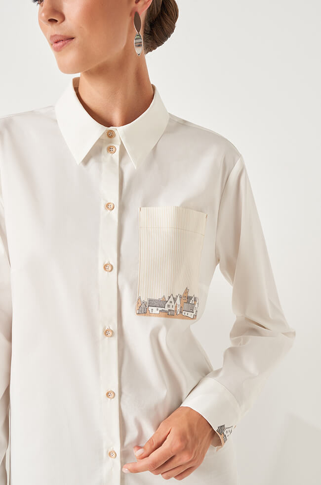 Блузка-рубашка свободного силуэта с отложным воротником-стойкой. Центральная застежка на контрастные пуговицы. Спереди накладной нагрудный карман с дизайнерским принтом. Рукава сосборены на манжету с разрезом и застежкой на пуговицы, по низу выполнен дизайнерский принт. В шов манжеты заложены складки, спинка с кокеткой.