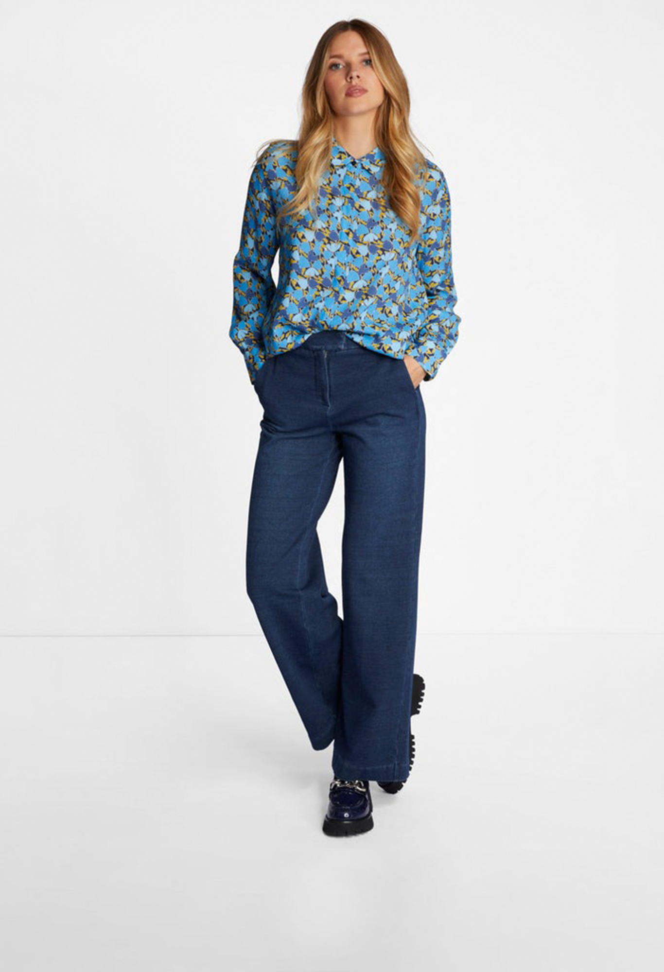 Рубашка свободного кроя украшена ярким акварельным принтом на мягкой струящейся вискозе из переработанных материалов. Модель с классической планкой на пуговицах и воротником.