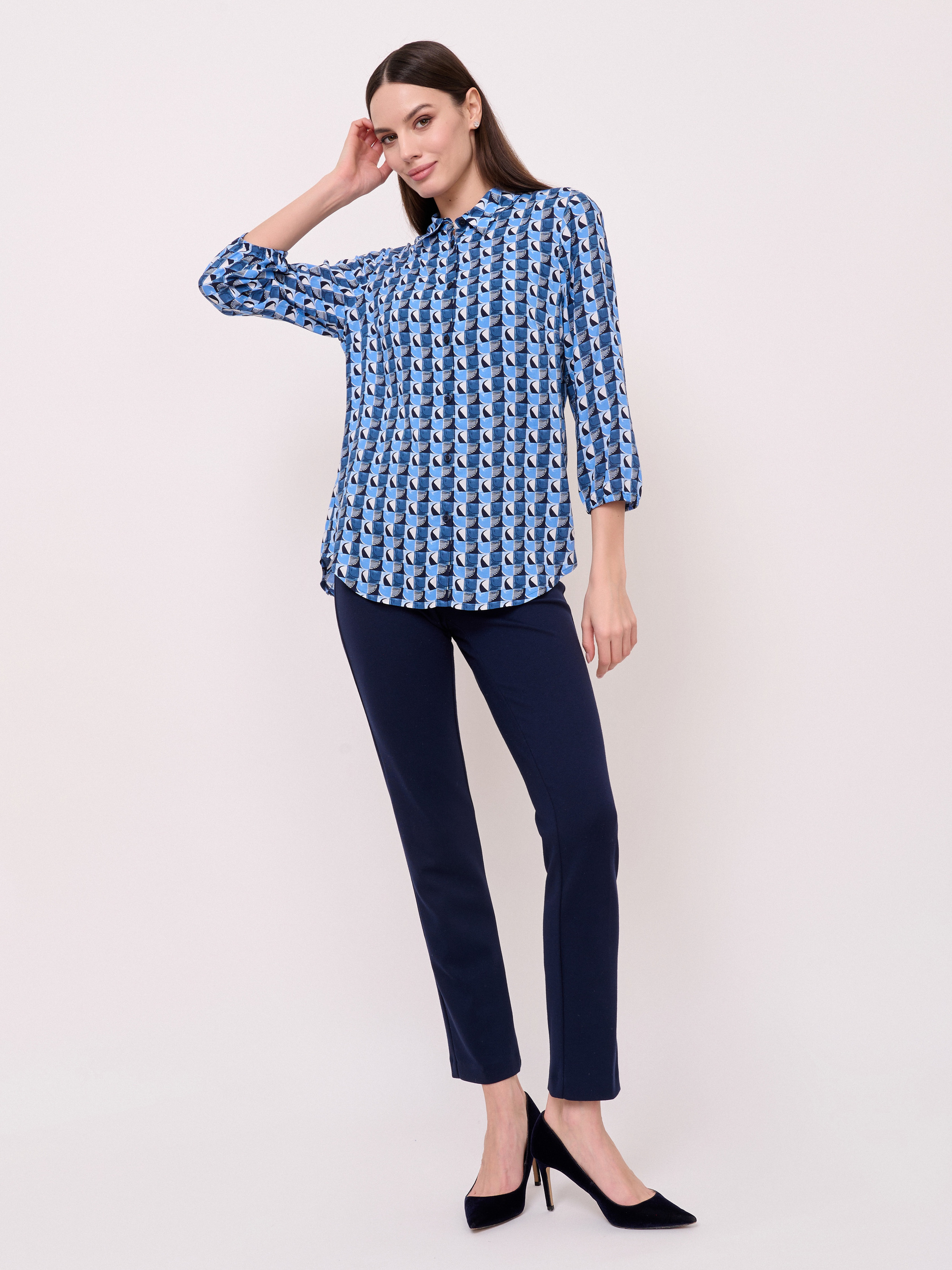 Детали: застежка пуговицы, вырез горловины отложной воротничок, рукава длинные, покрой рубашечный, рисунок орнамент. Длина по спинке: 65 см.