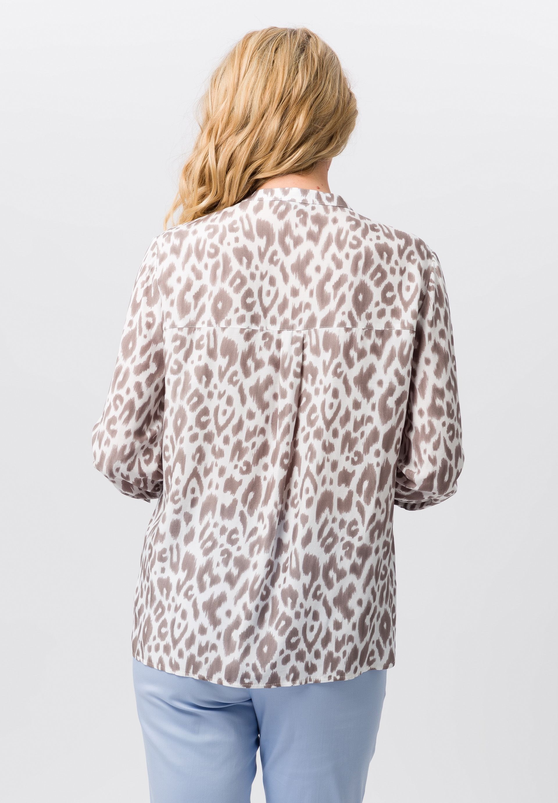 Блузка с леопардовым узором. Изготовленная из высококачественной вискозы с волокнами ECOVERO™, эта одежда гарантирует удобную посадку и долговечность. Современный круглый вырез с планкой и узкая планка на пуговицах придают блузке элегантный вид, а панно с леопардовым узором привлекают внимание. Длина в 42 размере 62 см.