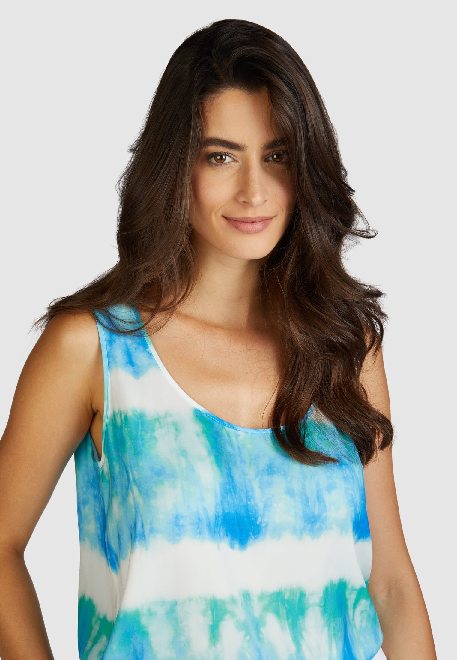 Блуза с круглым вырезом и принтом батик из небрежно драпированного японского атласа придает изысканный и свежий вид. Вырезы отделаны окантовкой. Изогнутый подол дополнен боковыми разрезами для еще большего комфорта и струящегося стиля.