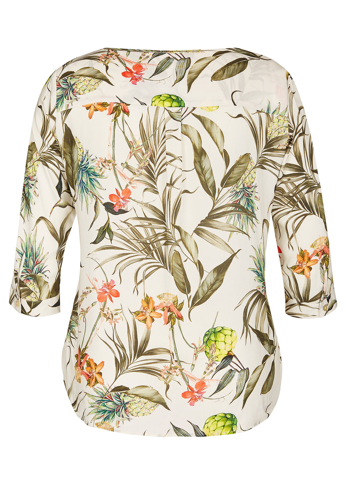 Блуза с трендовым тропическим принтом. Фигурный вырез горловины, рукав 3/4, кулиска по низу изделия, удлиненная спинка. Приятный к телу вискозный материал.