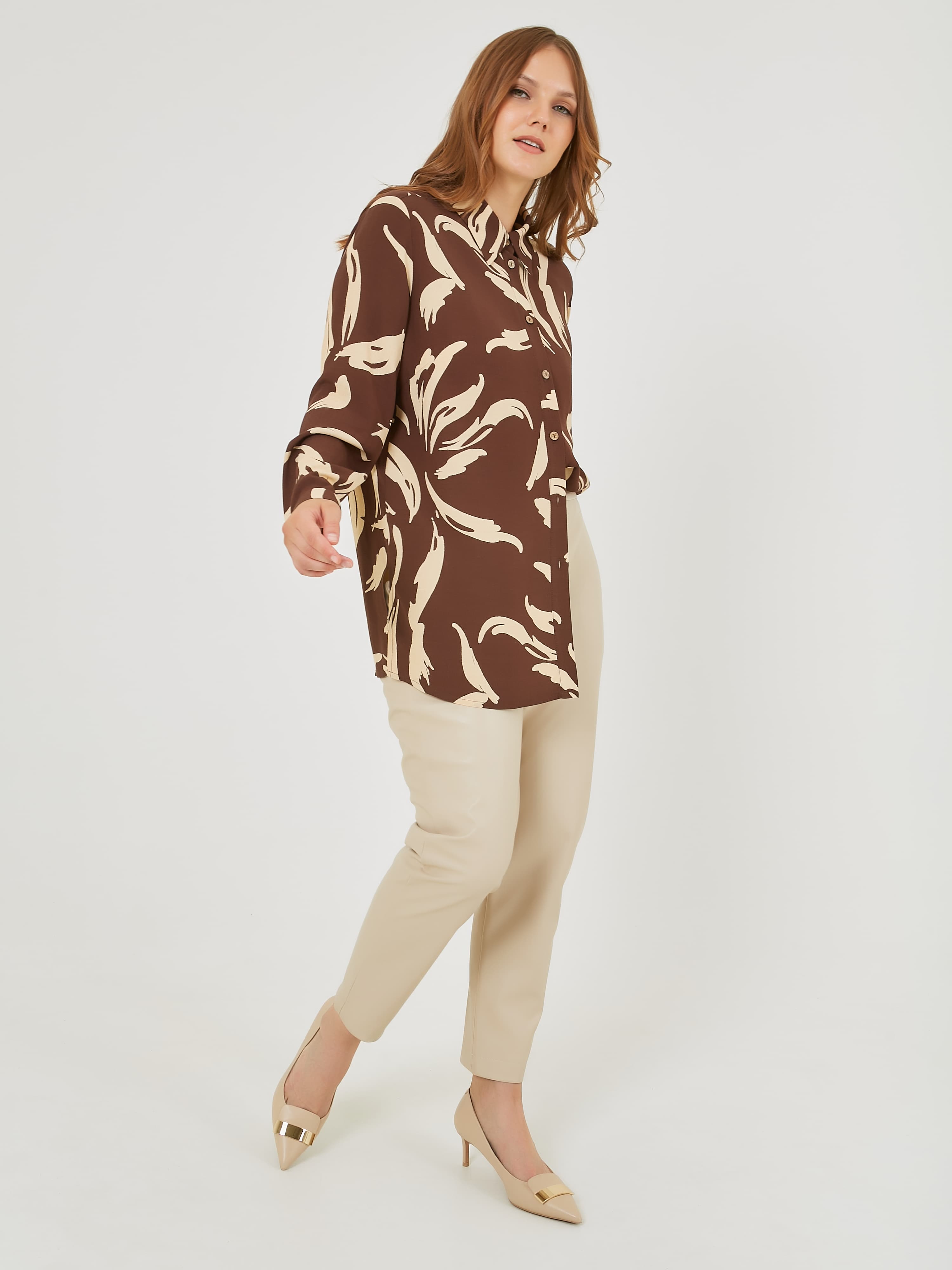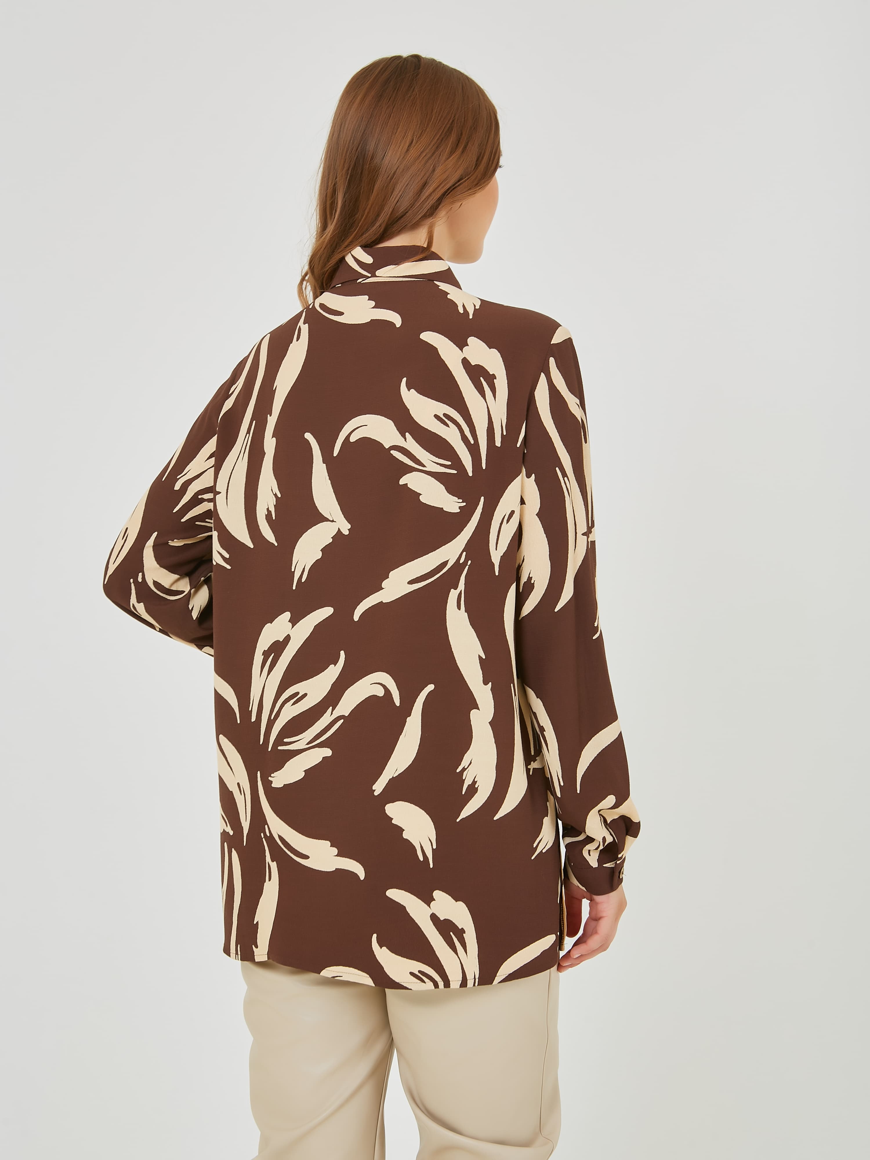 Лёгкая блузка из вискозы с планкой и застежкой на пуговицы по переду. Длинные рукава с узкими манжетами на пуговицах. Осень-Зима'25/26. Капсула "Хозяйка медной горы"