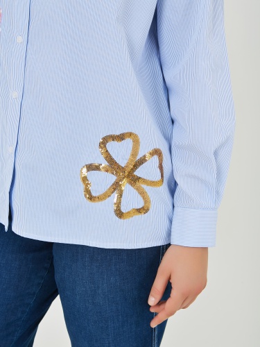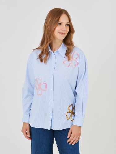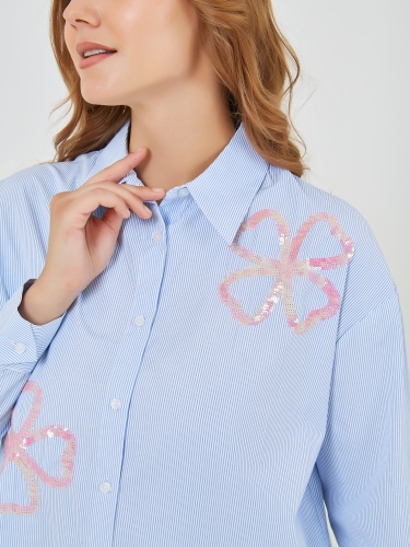 Классическая рабашка на пуговицах в вертикальную полоску. Украшена цветами из пайеток разных цветов. Коллекция Весна-Лето 2025. Капсула "Самарканд". Параметры модели: 95-64-101, рост 175, размер 44-46