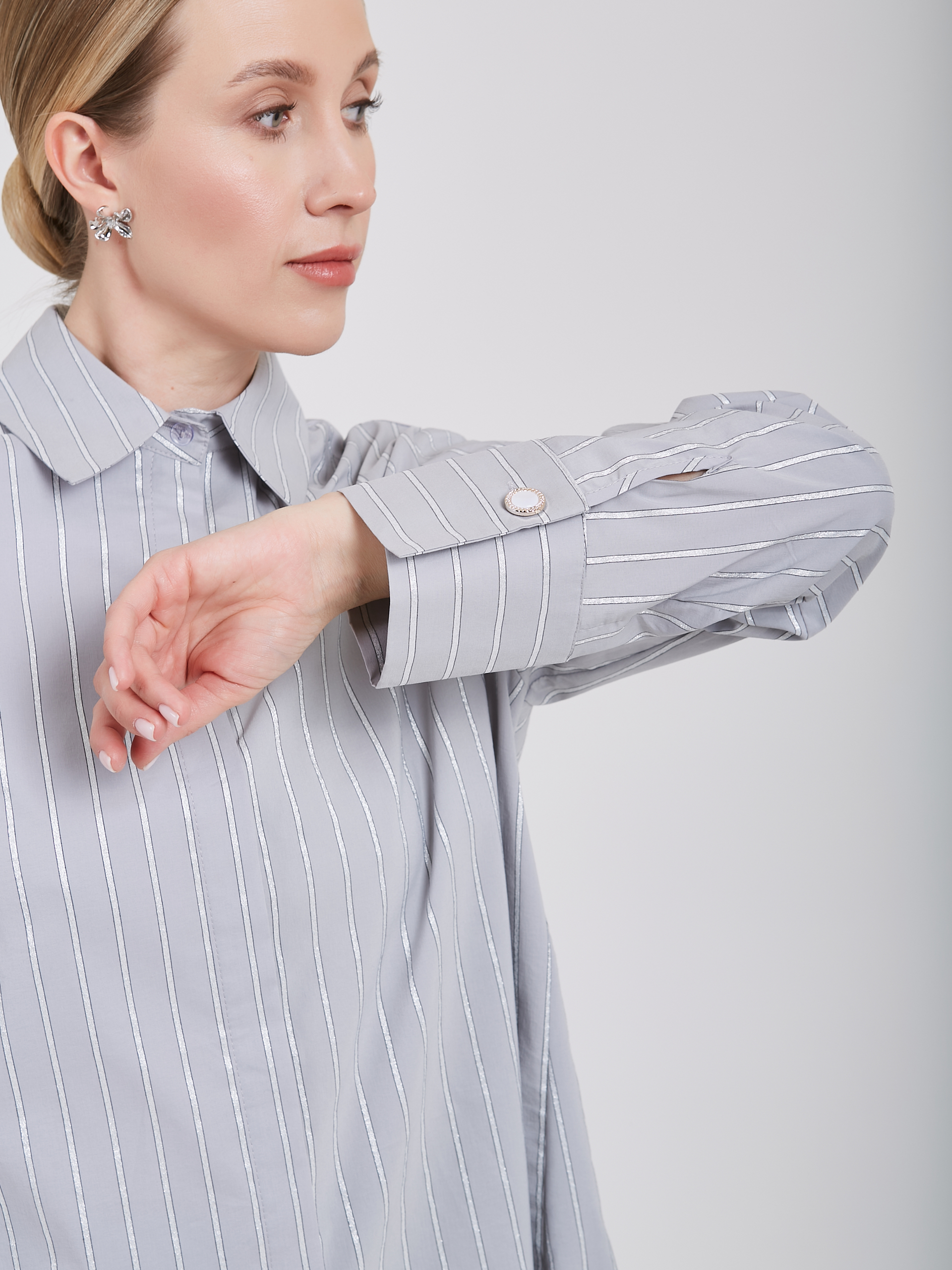 Серая рубашка с классическим воротником и манжетами. Длинные рукава и аккуратные вертикальные полосы делают образ строгим и элегантным.Осень-Зима'25/26. Капсула "Вишневый сад"
