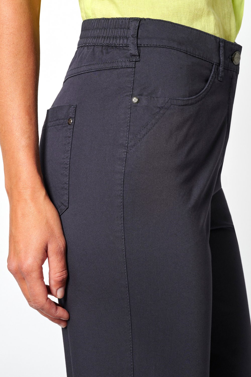 Укороченные однотонные брюки идеально подходят для поддержания делового стиля в теплую и жаркую погоду. Прекрасно сочетаются с блузой. А в комплекте с футболкой станут частью повседневного образа. Эластичный пояс обеспечивает комфортную посадку, а состав из хлопковой смеси позволяет телу дышать. Передние прорезные и накладные задние карманы.