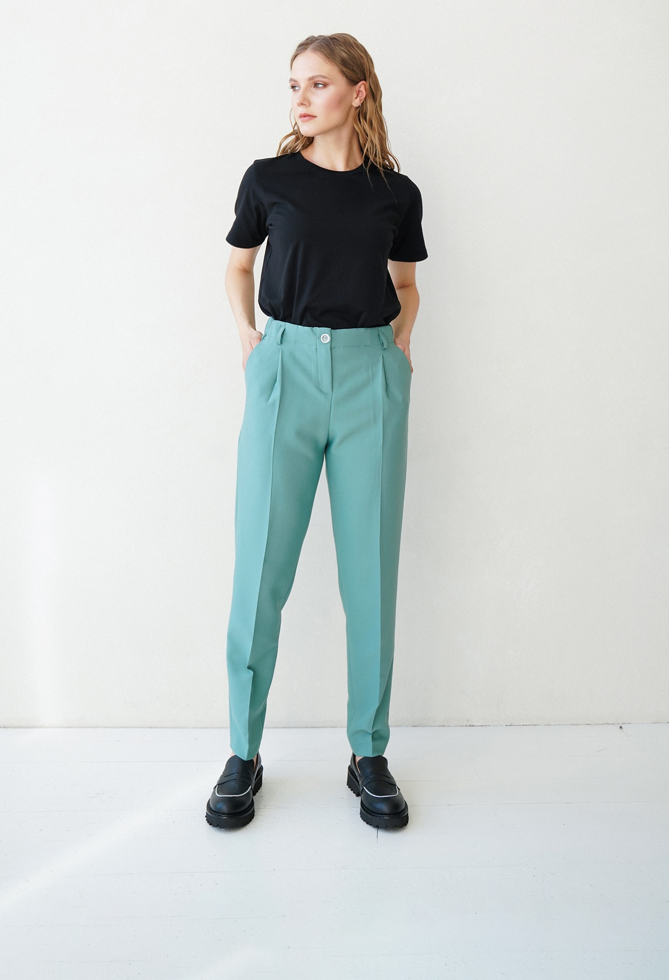 На сайте указаны российские размеры. Ткань: смесовая ткань средней плотности (68% полиэстер, 28% вискоза, 4% эластан) Крой: классическая модель прямого силуэта со стрелками, изящными защипами и удобными функциональными карманами. Средняя посадка гармонизирует силуэт, подчеркивает талию и скрывает возможные недостатки в области живота и бедер. Отделка: стрелка визуально удлиняет силуэт, делая его более подтянутым. Застегиваются на оригинальную пуговицу с жемчужным сиянием. Сзади два прорезных кармана. Имеют шлевки, что позволяет дополнять образ ремнем.