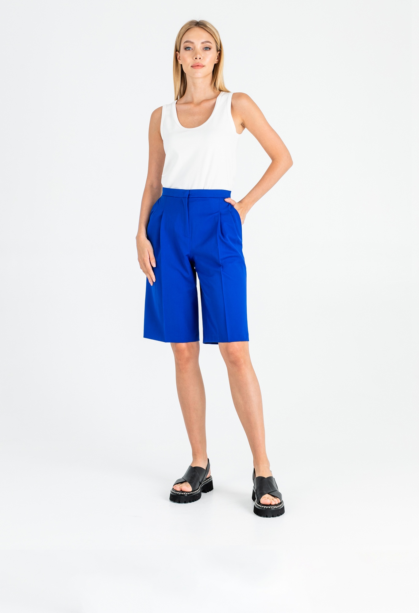 На сайте указаны российские размеры. Ткань: выполнены из немнущегося полиэстера с добавлением вискозы и эластана. Подходят для лета и носки в межсезонье. Крой: прямые шорты-бермуды ультрастильного оттенка «электрик» делают образ ярким и запоминающимся. Высокая посадка не только добавляет благородства, но и мастерски подчеркивает область талии. Два защипа в области функциональных карманов изысканно драпируют ткань и гармонизируют область бедер. Стрелки в передней и задней части шорт создают идеальную вертикаль, которая делает силуэт стройным и подтянутым. Отделка: цвет – главный аргумент этой модели, который не требует дополнительных деталей. Сзади – имитация карманов с листочкой. Спереди застегиваются на удобную молнию. Идеально сочетаются с трикотажем, жакетами, блузками и рубашками из ассортимента Stern. Рост модели - 177 см