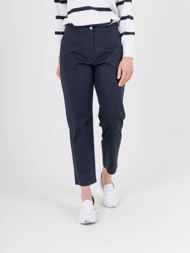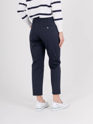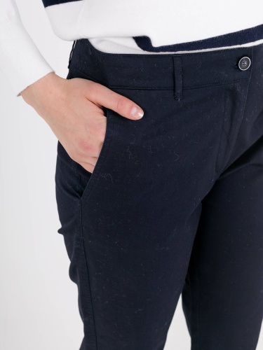 Прямые брюки с завышенной талией длиной до щиколотки с застежкой на молнию и 1 пуговицу. На передних половинках расположены два кармана с отрезным бочком. На правой задней половинке прорезной карман «в рамку» с прорезной петлей и пуговицей, для фиксации кармана. Верх брюк обработан поясом со шлевками.