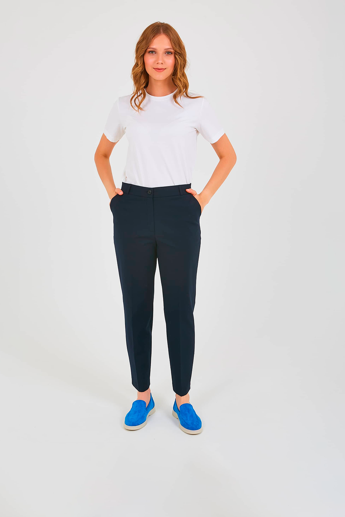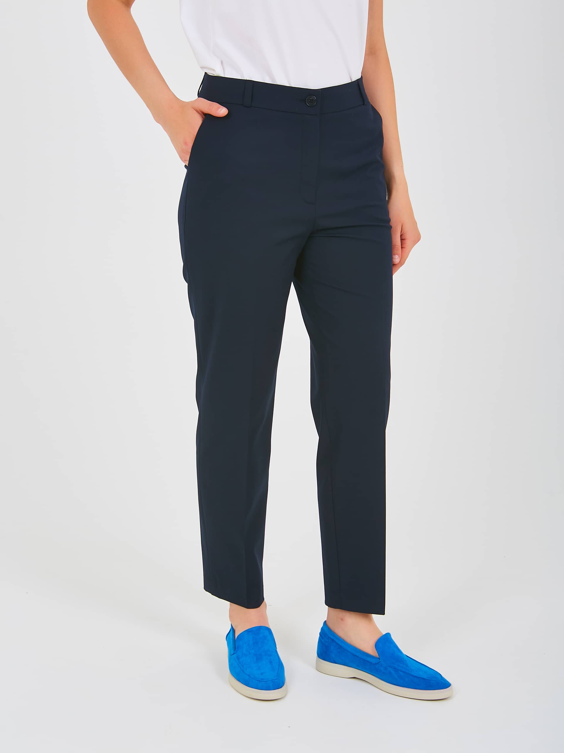 Прямые брюки с завышенной талией, длиной до щиколоток с застежкой на молнию и 1 пуговицу. Брюки слегка зауженные книзу. На передних половинках расположены два кармана с отрезным бочком. Верх брюк обработан поясом со шлевками.