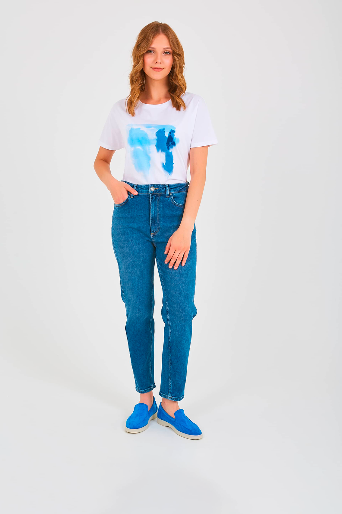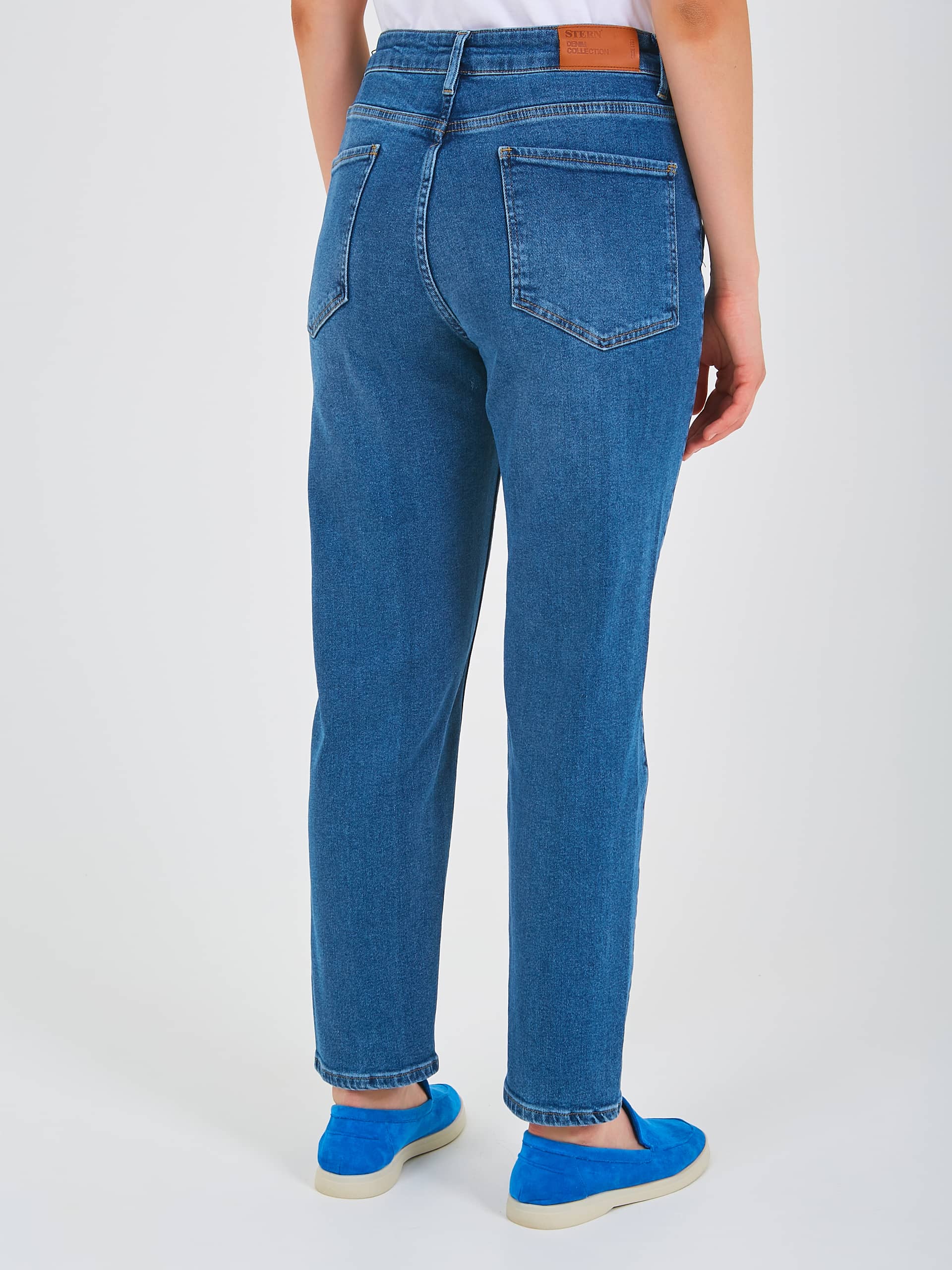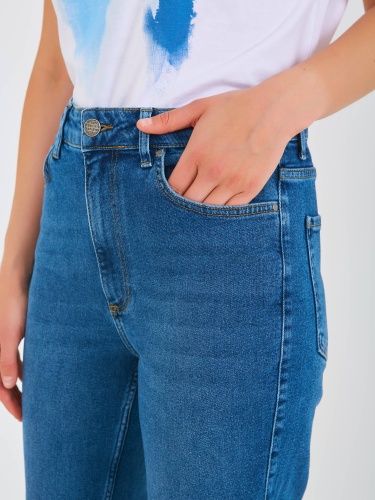 Джинсы «mom» длиной до щиколотки с застежкой на молнию и 1 пуговицу. Джинсы слегка зауженные книзу. На передних половинках расположены два кармана с отрезным бочком и один монетный карман. На задних половинках два накладных кармана и фигурная кокетка. Верх брюк обработан поясом со шлевками.