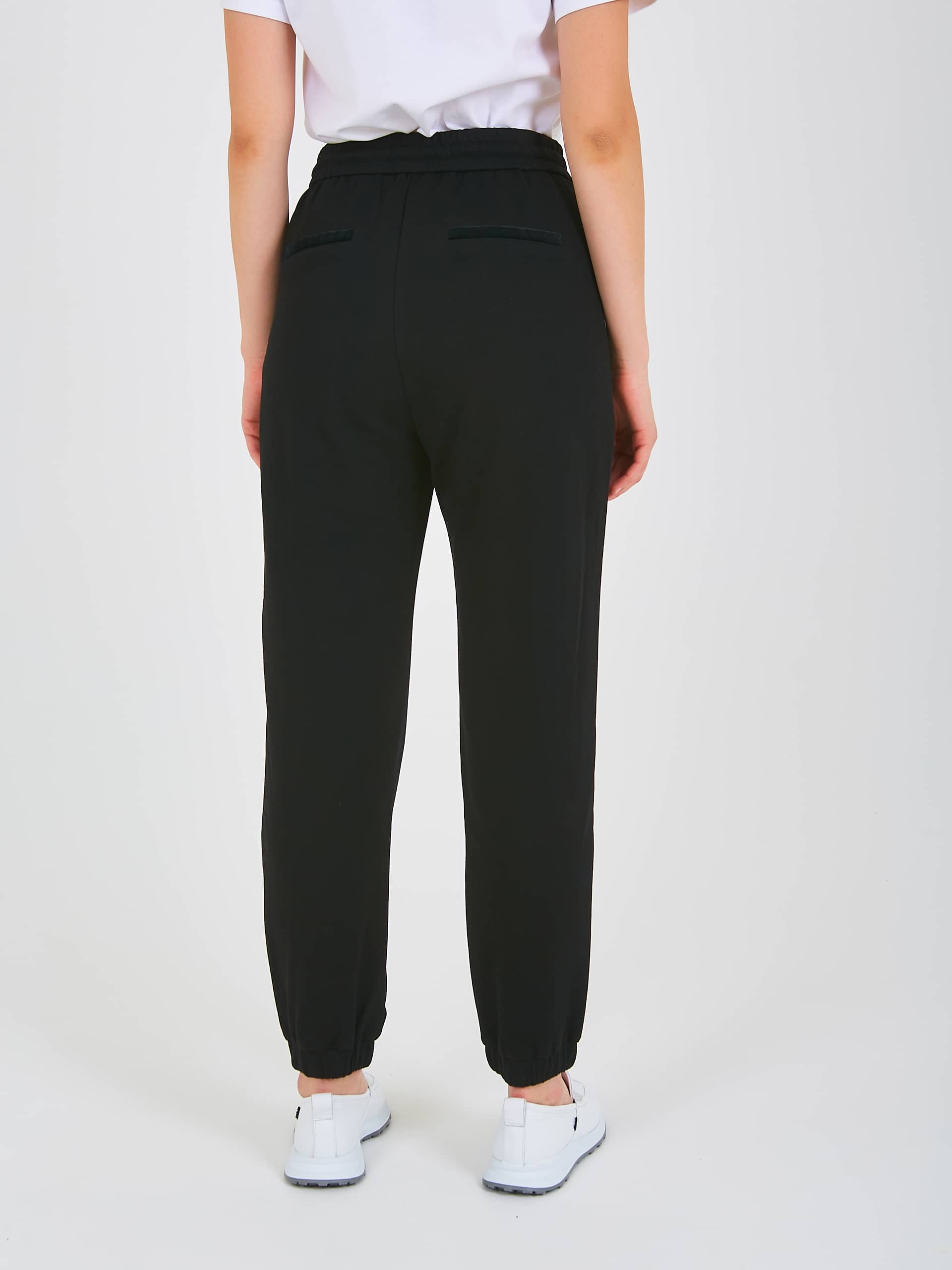 Спортивные брюки с завышенной талией длиной до щиколотки без застежки, дизайнерская особенность – использование двух разных по фактуре материалов, один из которых создает имитацию «звездного неба». На передних половинках расположены два кармана с отрезным бочком – имитация накладных карманов и декоративными молниями. На задних половинках брюк расположены карманы с листочкой. Верх брюк обработан поясом на резинке со шнуром для регулировки объема и металлическими наконечниками. Низ брюк присборен на манжету.