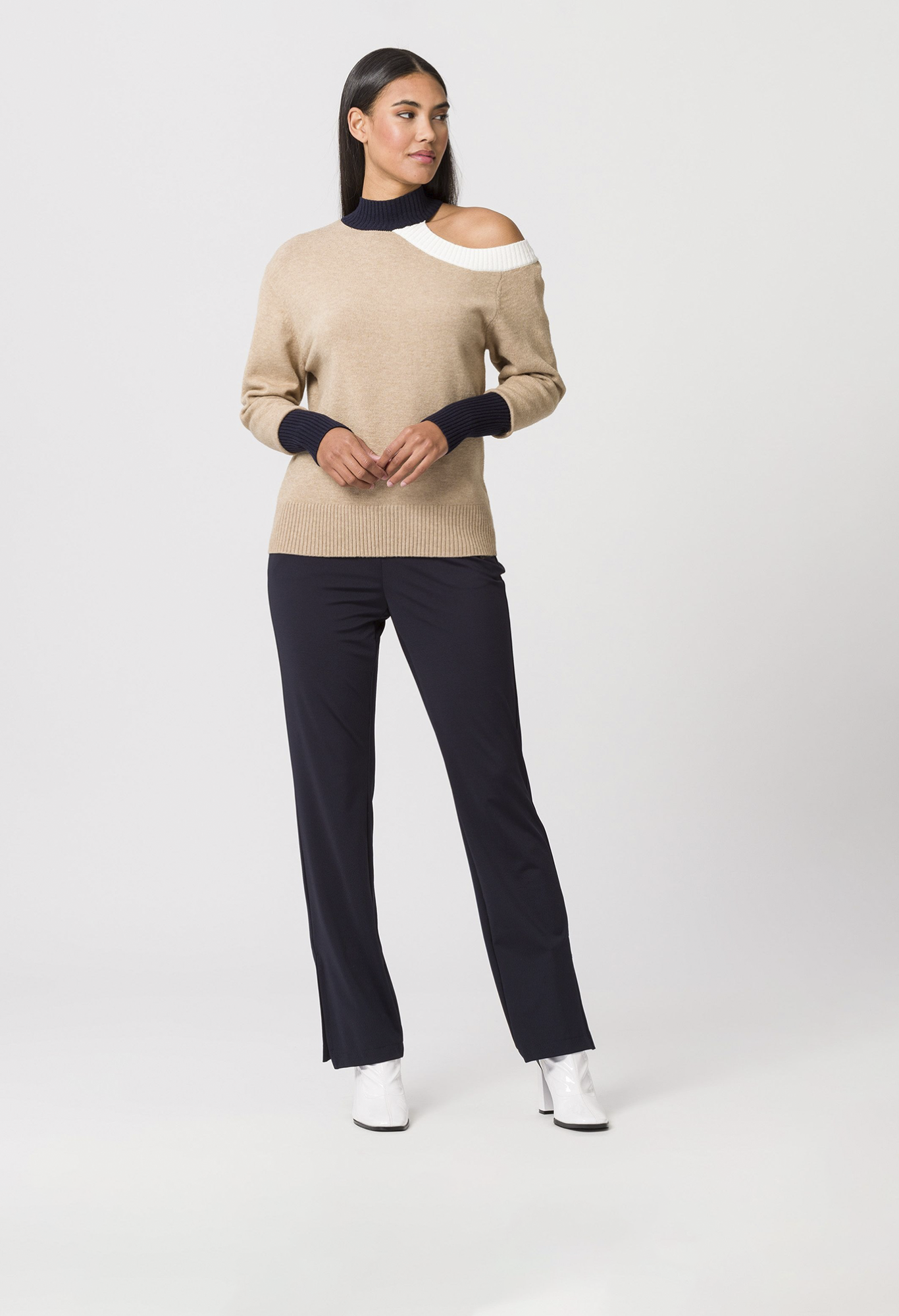 Брюки женские с декоративным прорезным карманом сзади. Прямые брючины облегают фигуру, эластичный трикотаж, за которым легко ухаживать, имеет струящуюся драпировку и мягкий на ощупь. Вневременной однотонный образ дополнен изящным принтом на левом кармане брюк