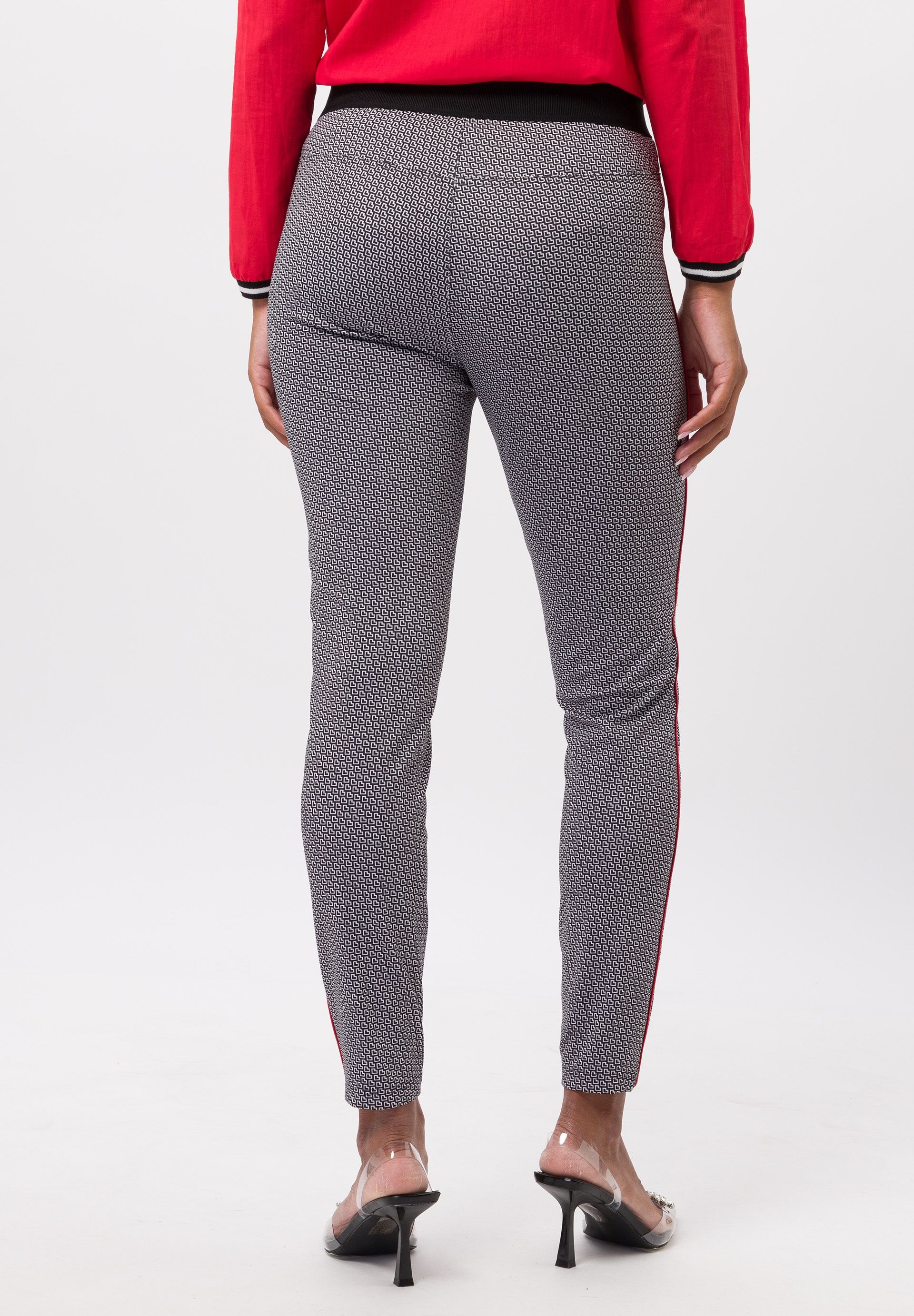 Брюки женские с контрастными полосками по бокам. Сочетание приятной эластичности, модного рисунка по всей поверхности, контрастных боковых полос, ламинированных карманов на молнии и контрастного эластичного пояса не оставит равнодушным ни одно модное сердце. Брюки этого классного дизайна незаменимы и станут изюминкой любого образа.