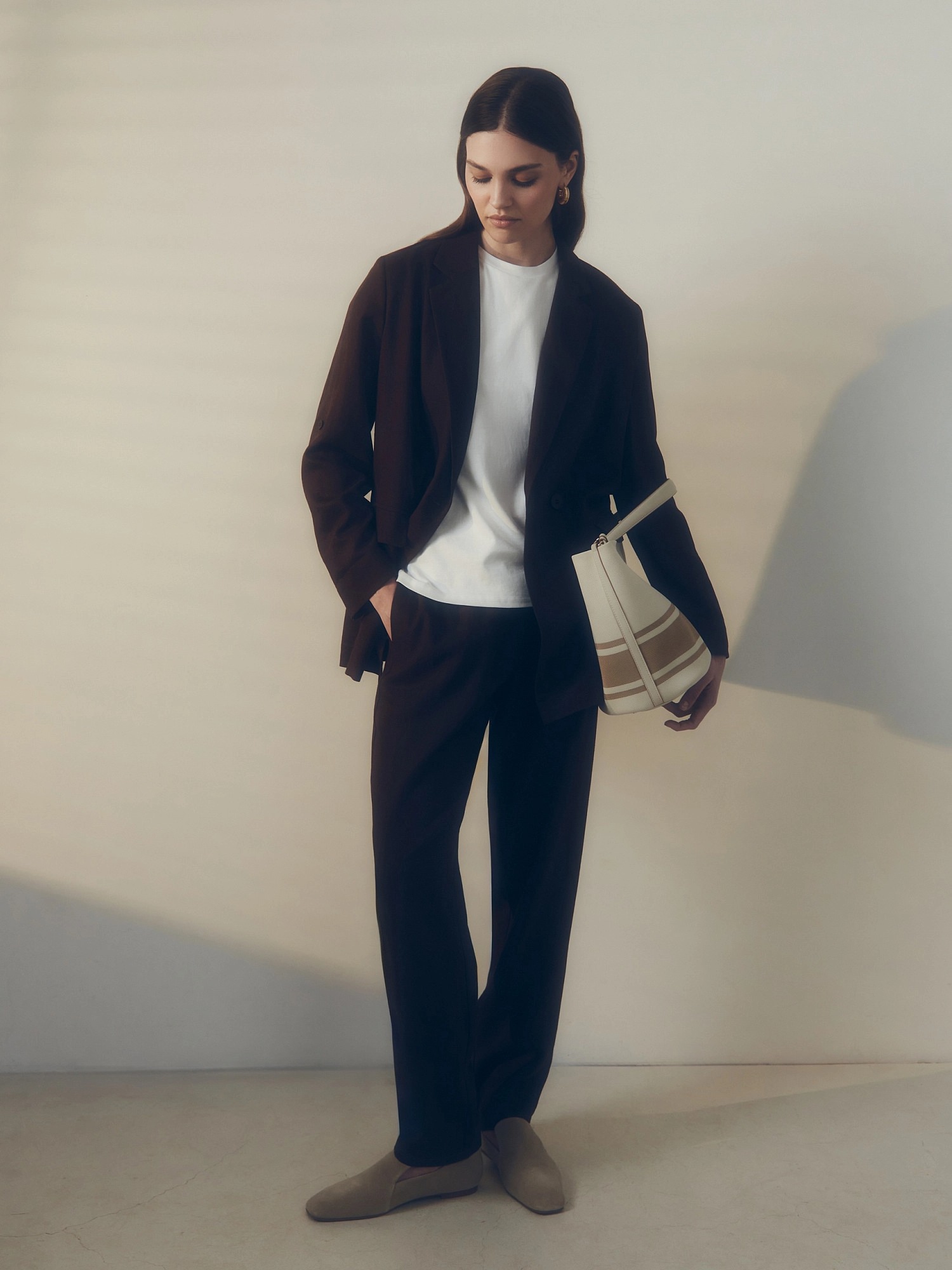 Прямые брюки из льняной ткани в благородном шоколадном цвете на притачном поясе с резинкой и имитацией гульфика. Рабочие карманы в боковых швах и один накладной карман на спинке. Модель идеально подходит для создания ансамбля с жакетом из аналогичной ткани.
