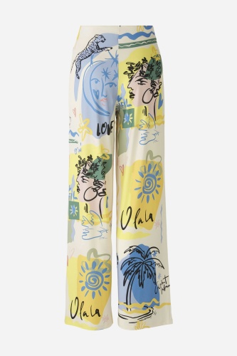 Высокоэластичный материал Silky Touch с принтом по всей поверхности и эластичными полосками по бокам. Повседневный крой с длинными штанинами. Максимальный комфорт благодаря скрытому эластичному поясу. Очень удобный, без застежек, легко надевается. Брюки не мнутся, не требуют глажки. Длина для размера 42: 78 см.