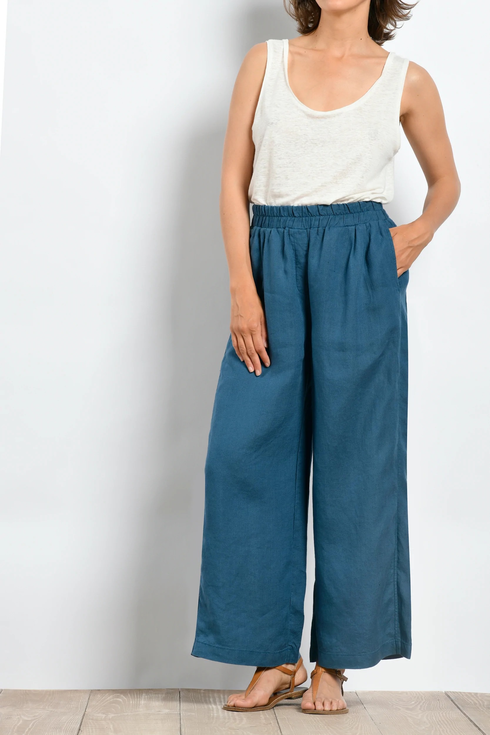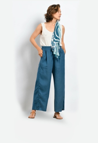 На сайте указаны Российские размеры. Льняные брюки широкого кроя с эластичным поясом.2 передних итальянских кармана. 2 накладных кармана с клапаном на пуговице сзади.