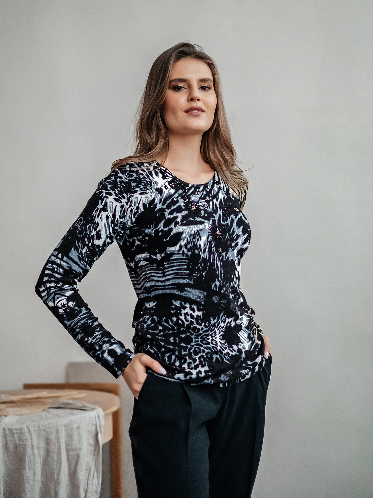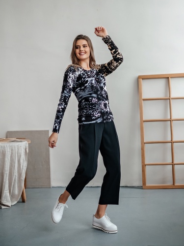 Теплый джемпер обращает на себя внимание благодаря цветочному принту в акварельном стиле. Прямой покрой, круглый вырез горловины, втачные рукава полной длины. Завершает изумительный дизайн декор из страз. Материал из вискозной смеси приятен к телу и обеспечивает комфорт.