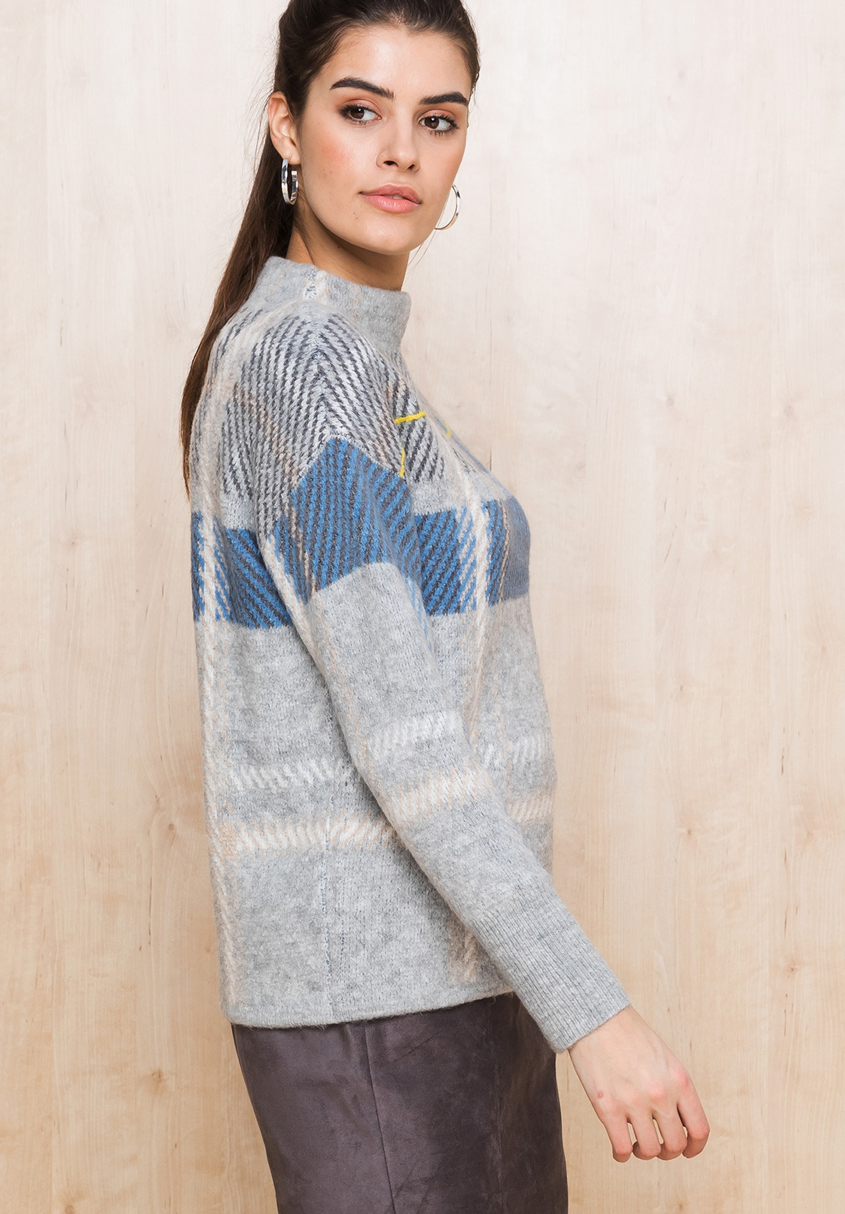 Джемпер свободного покроя великолепно дополнит ваш осенний образ. Вырез горловины "воронка", рукава полной длины со спущенным плечом. Новая интерпретация узора в клетку притягивает восхищенные взгляды. Смесовый материал приятен к телу и обеспечивает сохранение тепла.
