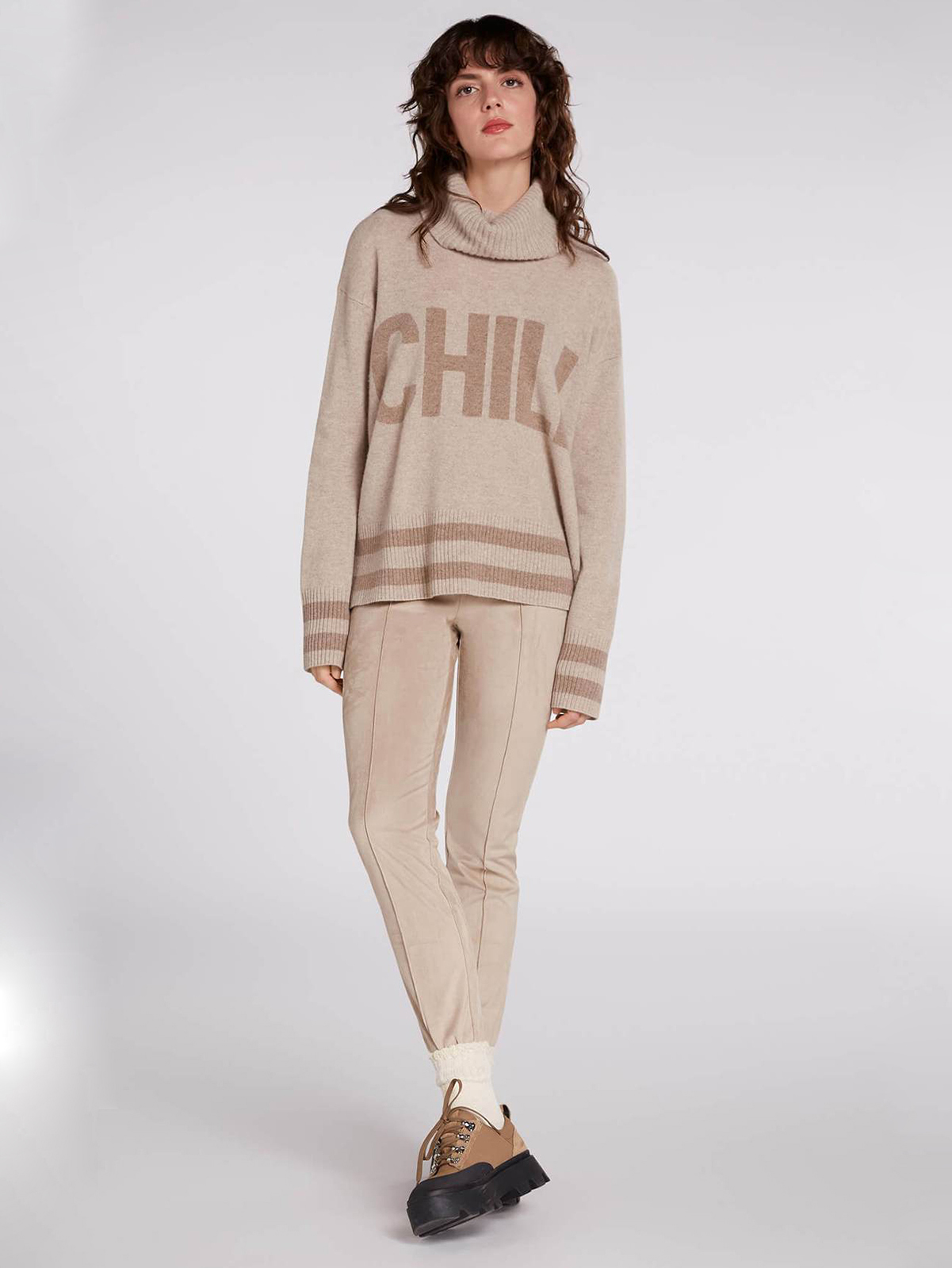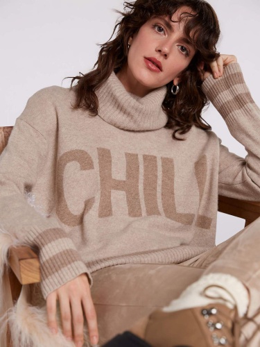 Пуловер базовой бежевой расцветки с оригинальной надписью спереди. Свободный силуэт, прямой крой, линия плеч спущена. Объемный воротник стойка, длинные втачные рукава с манжетами в рубчик.
