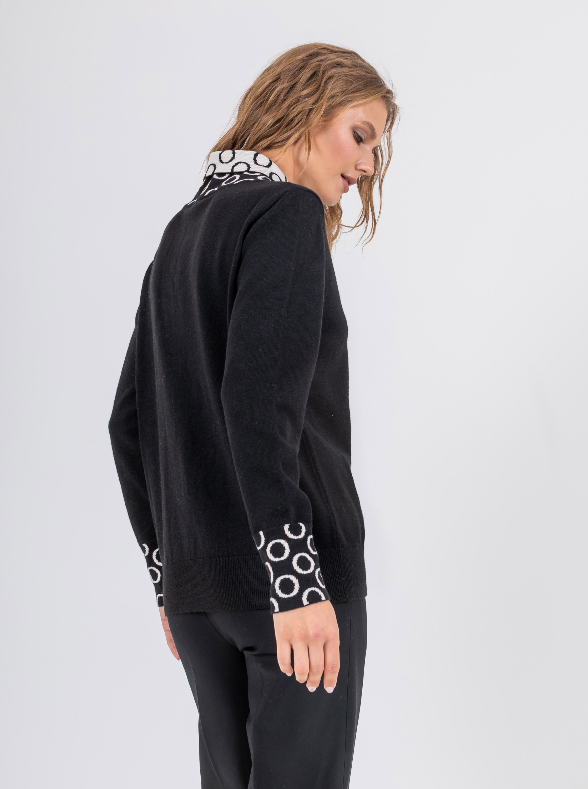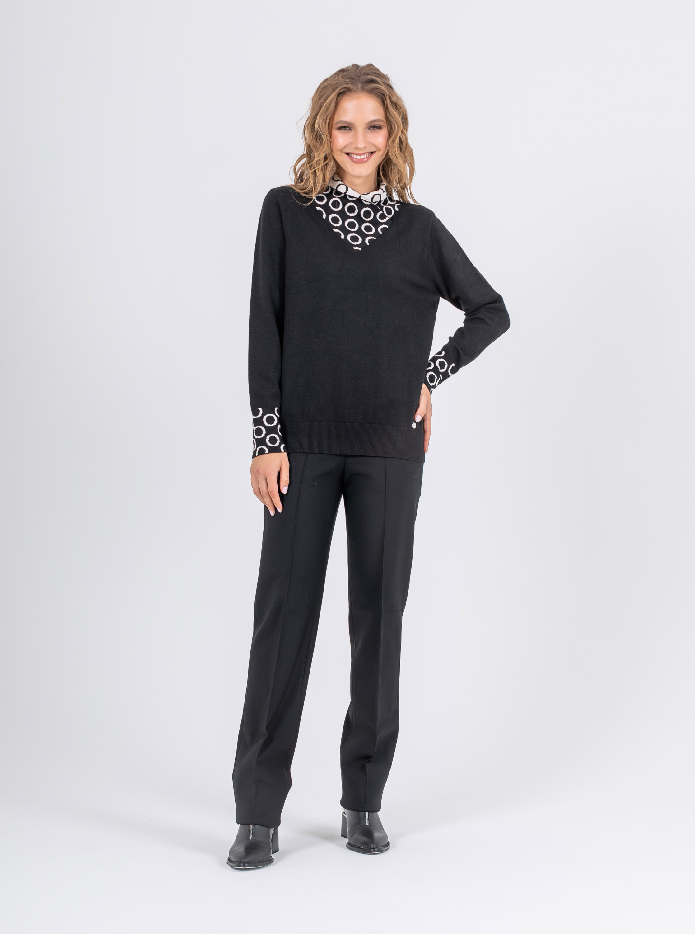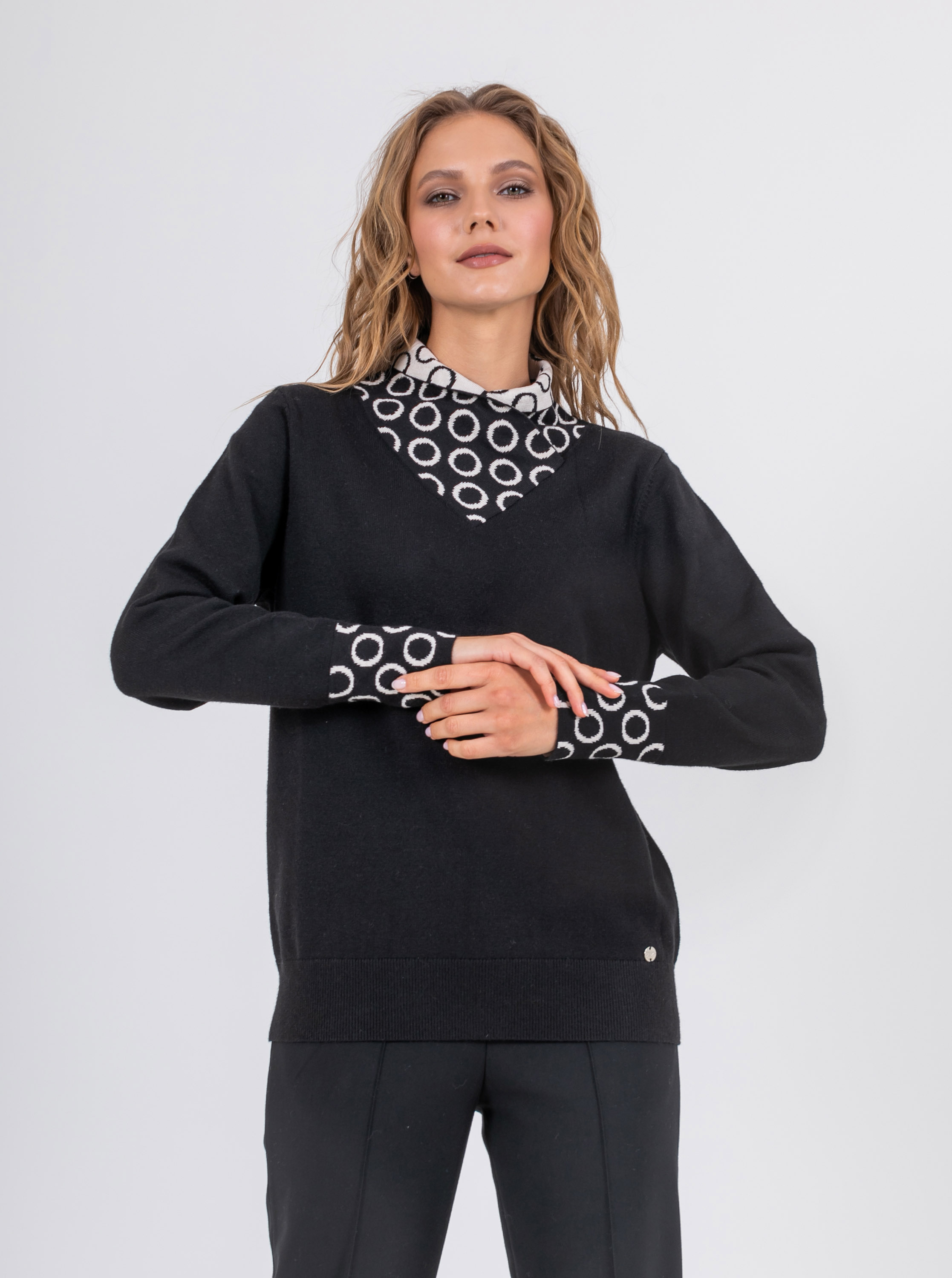 На сайте указаны российские размеры. Ткань: выполнен из качественного гладкого трикотажа. В составе 6% шерсть,10% нейлон, 59% полиэстер, 10% вискоза. Крой: слегка приталенный джемпер из гладкого трикотажа средней плотности. Женственная, подчеркивающая все достоинства фигуры модель создает гармоничный и спокойный образ, который захотят повторить. Оригинальный ворот выделяется своей необычной конструкцией и подчеркивает красоту шеи. Длинные, чуть свободные рукава с манжетом-резинкой, не сковывают движения, дарят комфорт и тело. Джемпер представлен в двух стильных цветах – черном и бежевом. Отделка: двусторонний ворот, сложенный изящным уголком, поражает воображение: контраст двух цветов, усиленный узором «круги», делает образ запоминающимся и на 100% стильным. Цветовое решение поддерживают и рукава с тем же принтом. Сочетайте с однотонными вещами из коллекции Stern, чтобы не смещать фокус внимания с красивой отделки джемпера. Рост модели: 174 см Длина по спинке: 60 см