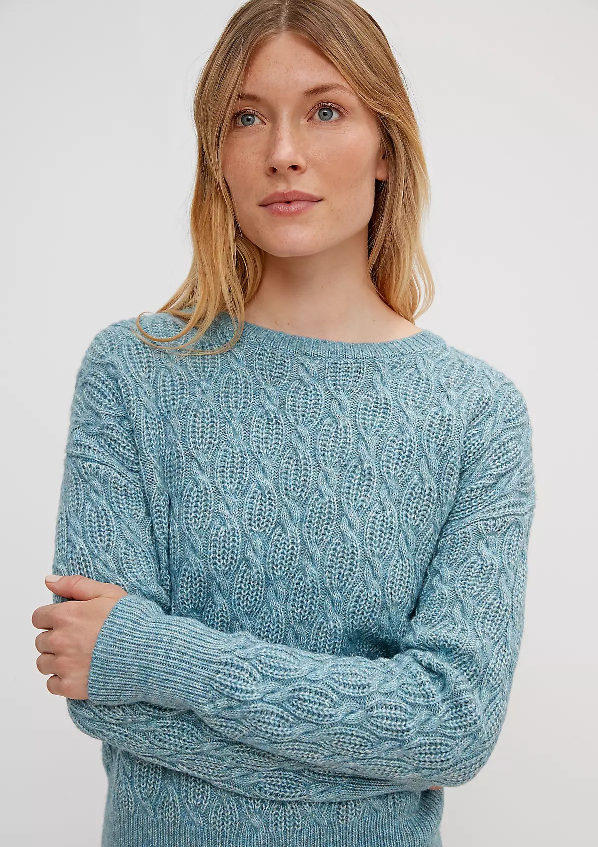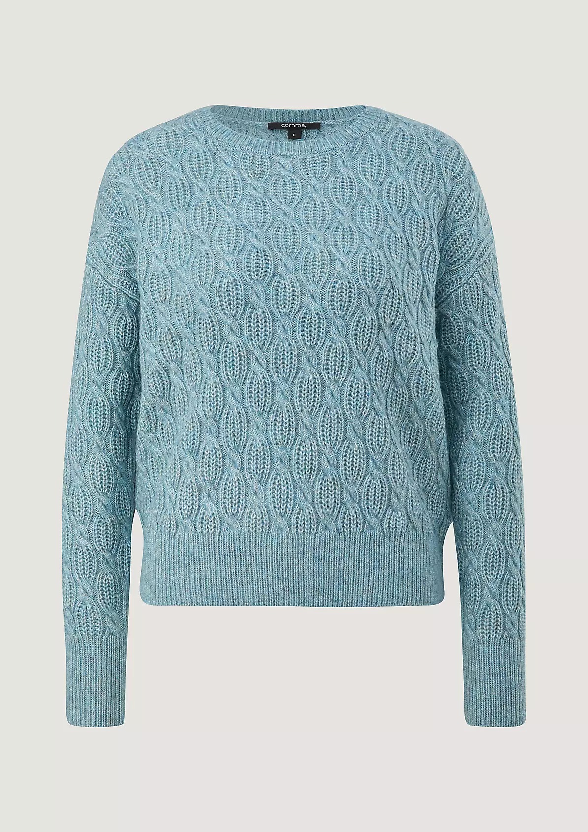 На сайте указаны российские размеры. Вязаный джемпер с круглым вырезом. Манжеты в рубчик, заниженная линия плеча. Детали: ребристые края, ребристая отделка. Длина спинки в 44 размере - 54 см.