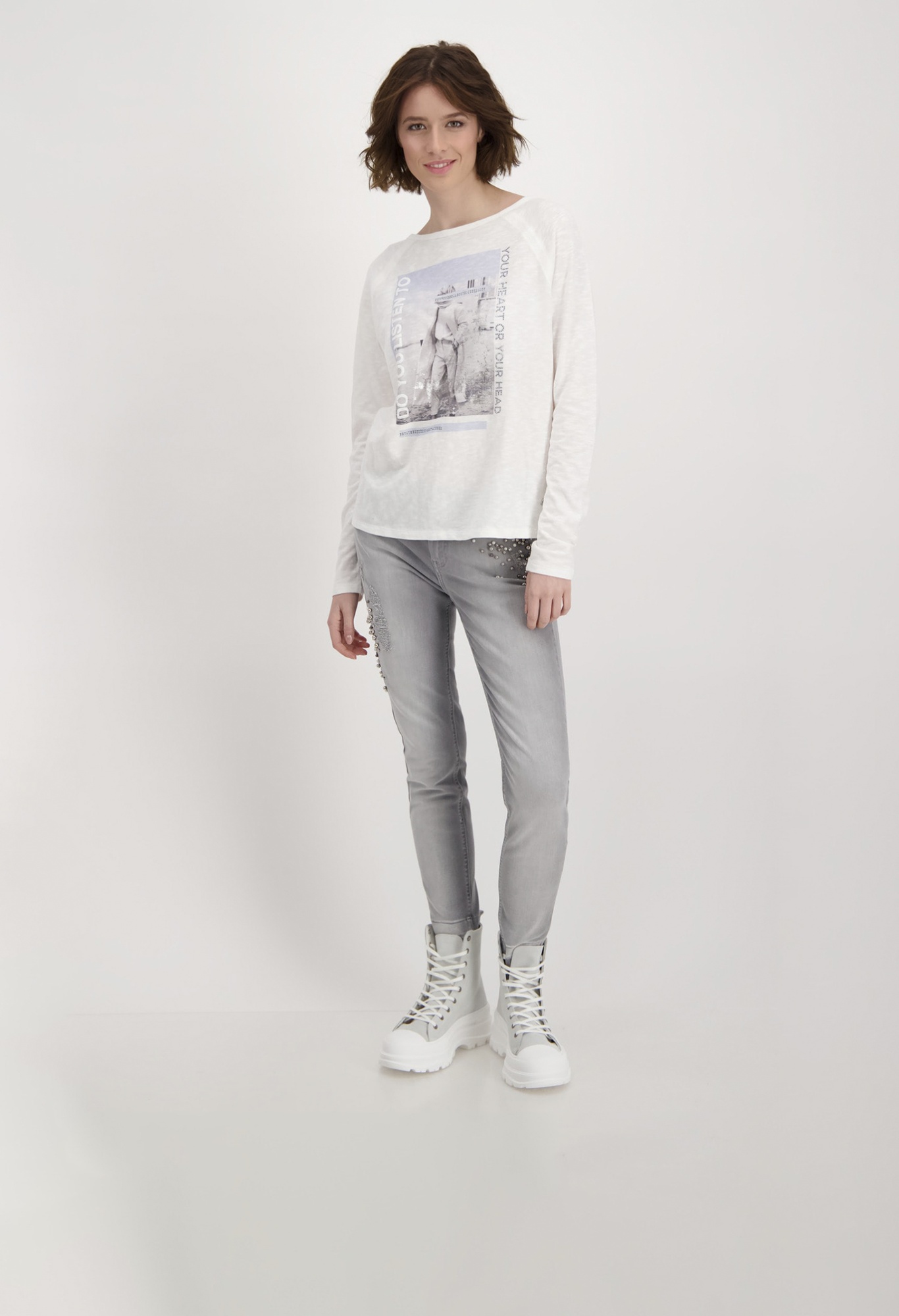 На сайте указаны российские размеры. Легкая рубашка с длинными рукавами и принтом из 100% хлопка. Прямой фасон состоит из круглого выреза горловины с рукавами реглан. Стильный образ с эффектом пряжи и фотопечатью с объемными надписями, сверкающими стразами и деталями с лаковым принтом спереди. 100% хлопок также обещает приятный и качественный комфорт при ношении. Произведите неизгладимое впечатление с вашим новым модным фаворитом. Модель ростом 178 см Длина платья 62 см