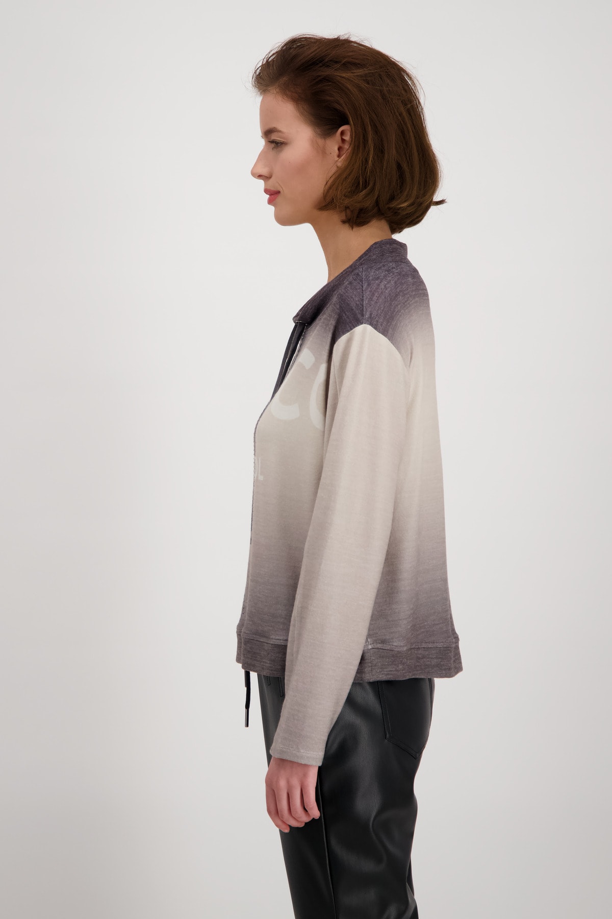 На сайте указаны российские размеры. Легкая толстовка с длинными рукавами, воротником-стойкой и принтом. Толстовка прямого кроя, воротник-стойка с люверсами и завязками, слегка приспущенная линия плеч и широкая манжета по низу. Красивый сплошной цветовой градиент прерывается фотопечатью с деталями в виде букв и сверкающими стразами спереди. Идеально сочетается с женственными кожаными брюками и крутыми черными ботинками. Модель ростом 178 см. Длина спины 44 размера 58 см.