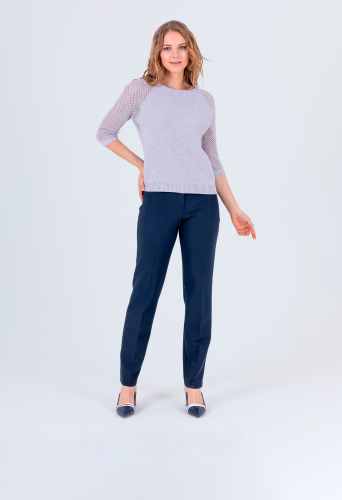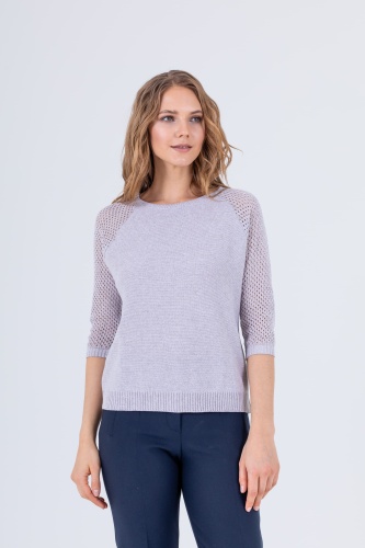 На сайте указаны российские размеры. Джемпер средней длины прямого силуэта из легкого хлопка с добавлением полиакрилонитрила, дизайнерская особенность модели – ажурный трикотаж на рукавах. Перед и спинка по низу обработаны манжетой. Рукава реглан ¾ с манжетами. Круглый вырез горловины.