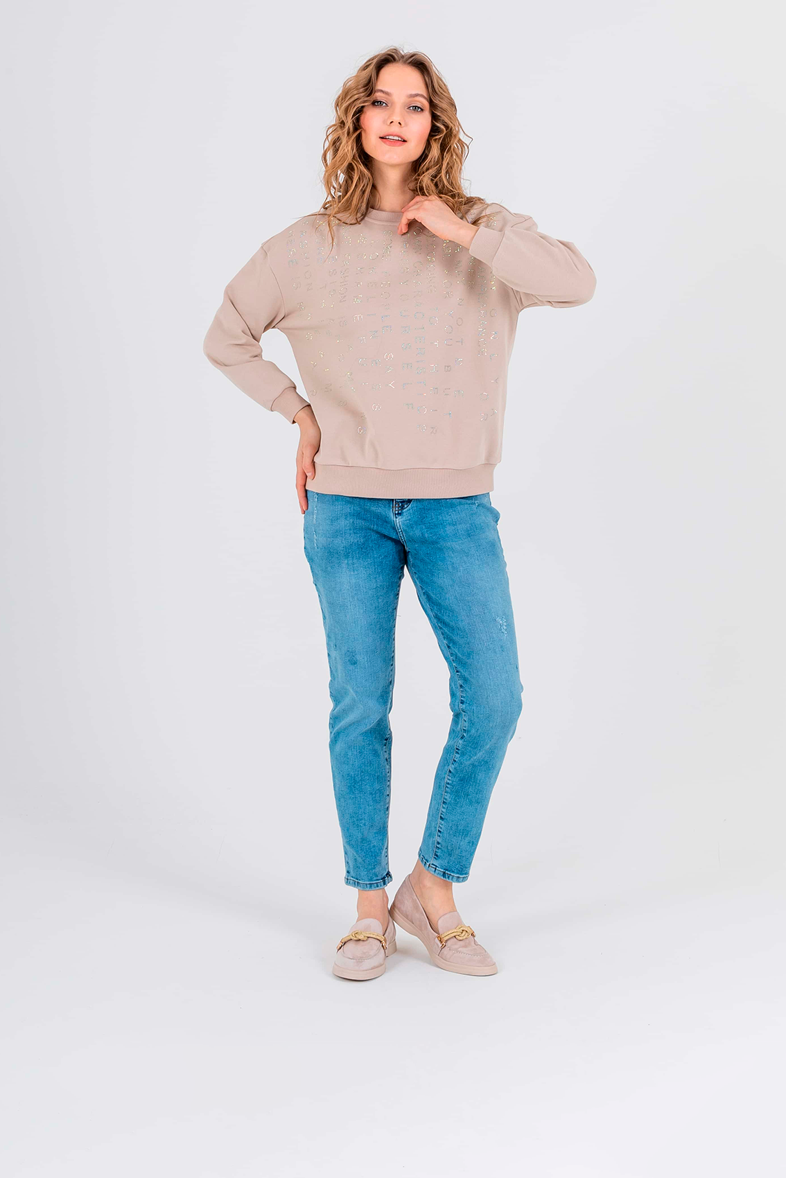 Свитшот прямого силуэта средней длины из легкого хлопка с добавлением полиэстера. Перед и спинка по низу обработаны манжетой. Перед украшен аппликациями в виде надписей из страз. Длинные втачные рукава со спущенной линией плеча и манжетами. Круглый вырез горловины.