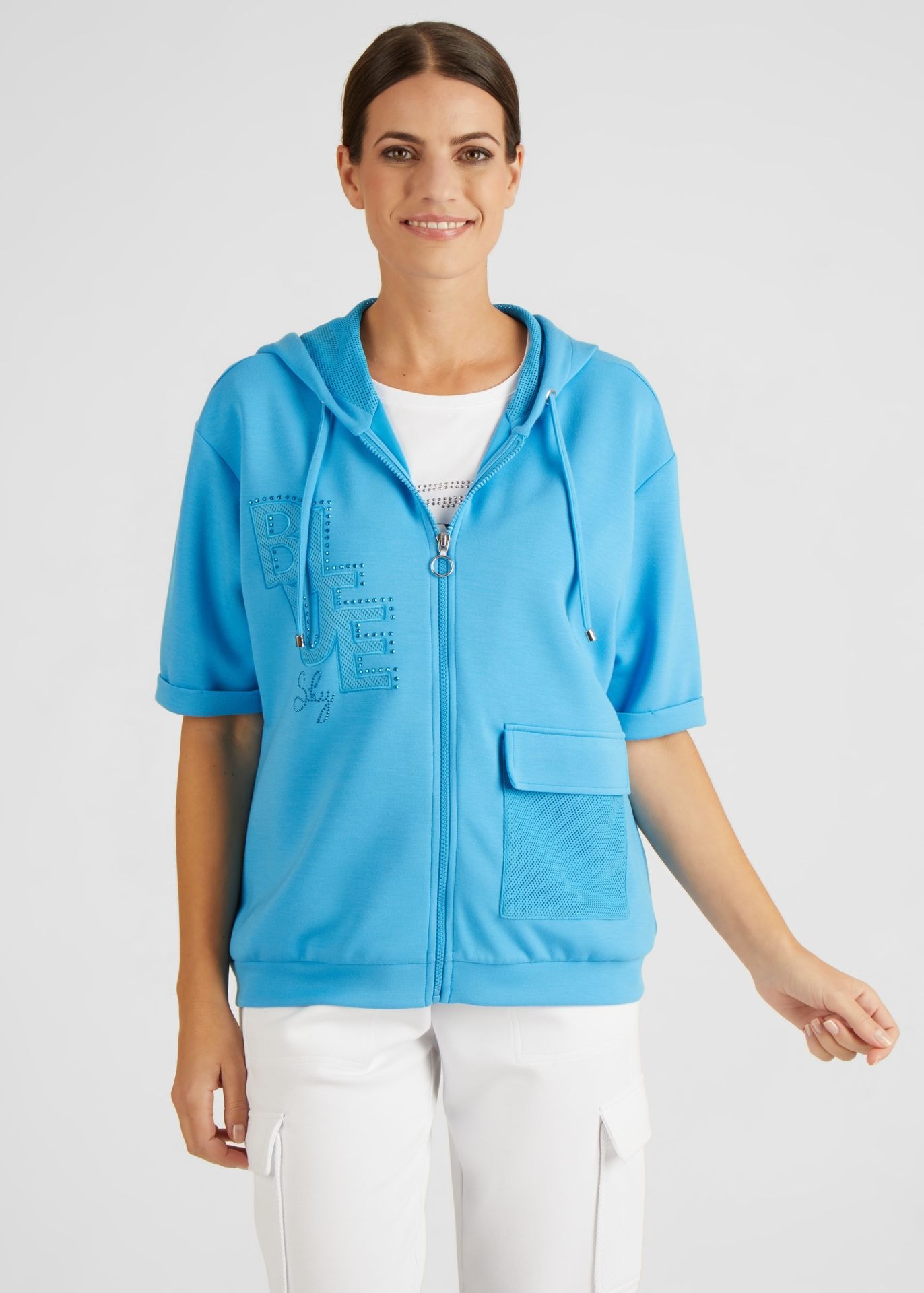 Эта модная толстовка с короткими рукавами, капюшоном и завязками подойдет для любого случая. Однотонная куртка имеет молнию. Особого упоминания заслуживают элегантные детали: вышитая надпись и стразы украшают переднюю часть куртки. Практичный накладной карман завершает дизайн. Толстовка – настоящий маст-хэв для женщин, следящих за модой. Длина по спинке от плеча для размера 46: 62 см.