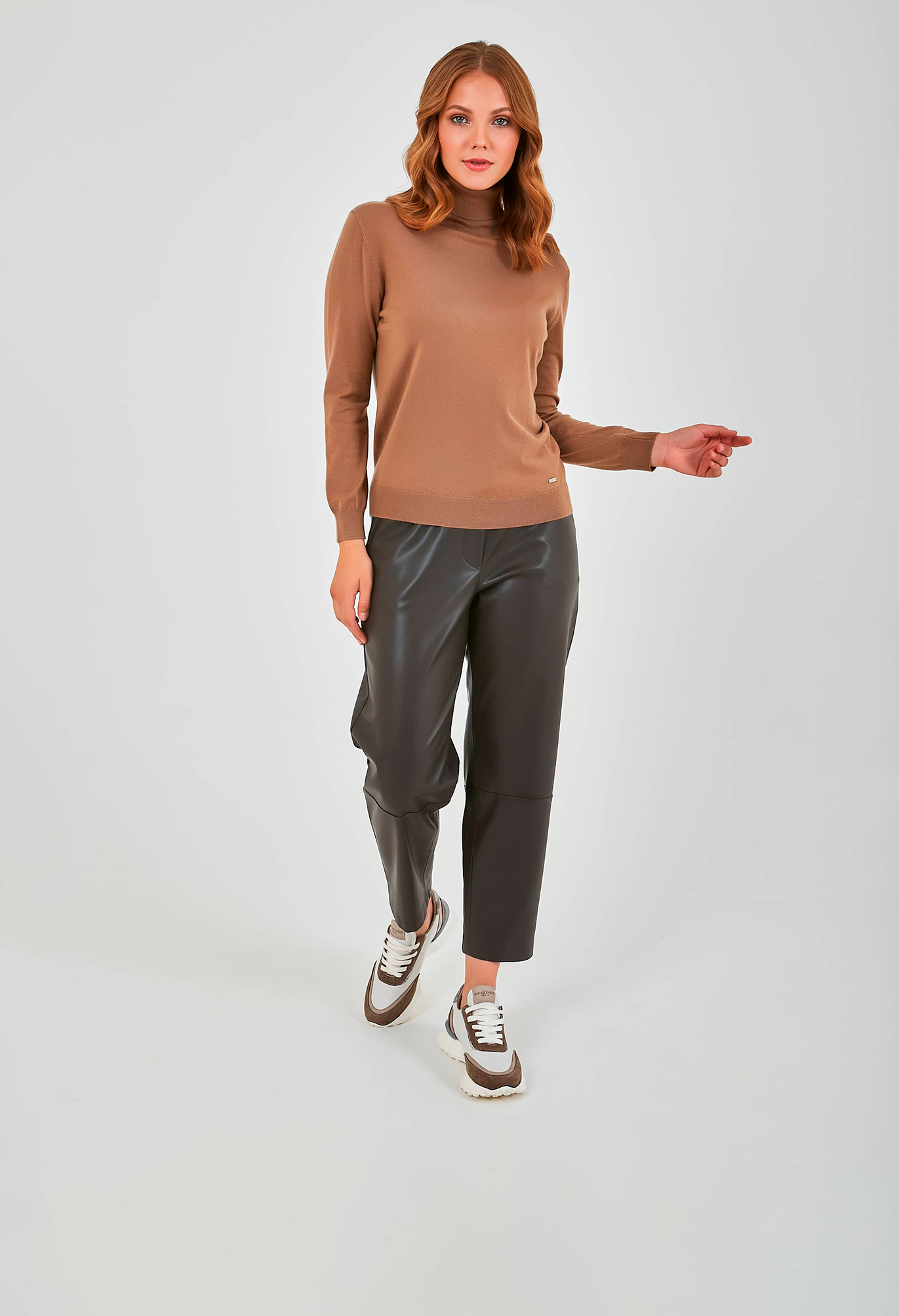 Джемпер средней длины прямого силуэта из акрила с добавлением тенсела и мягкой шерсти. Перед и спинка по низу обработаны манжетой. Длинные втачные рукава с манжетами. Воротник «гольф».