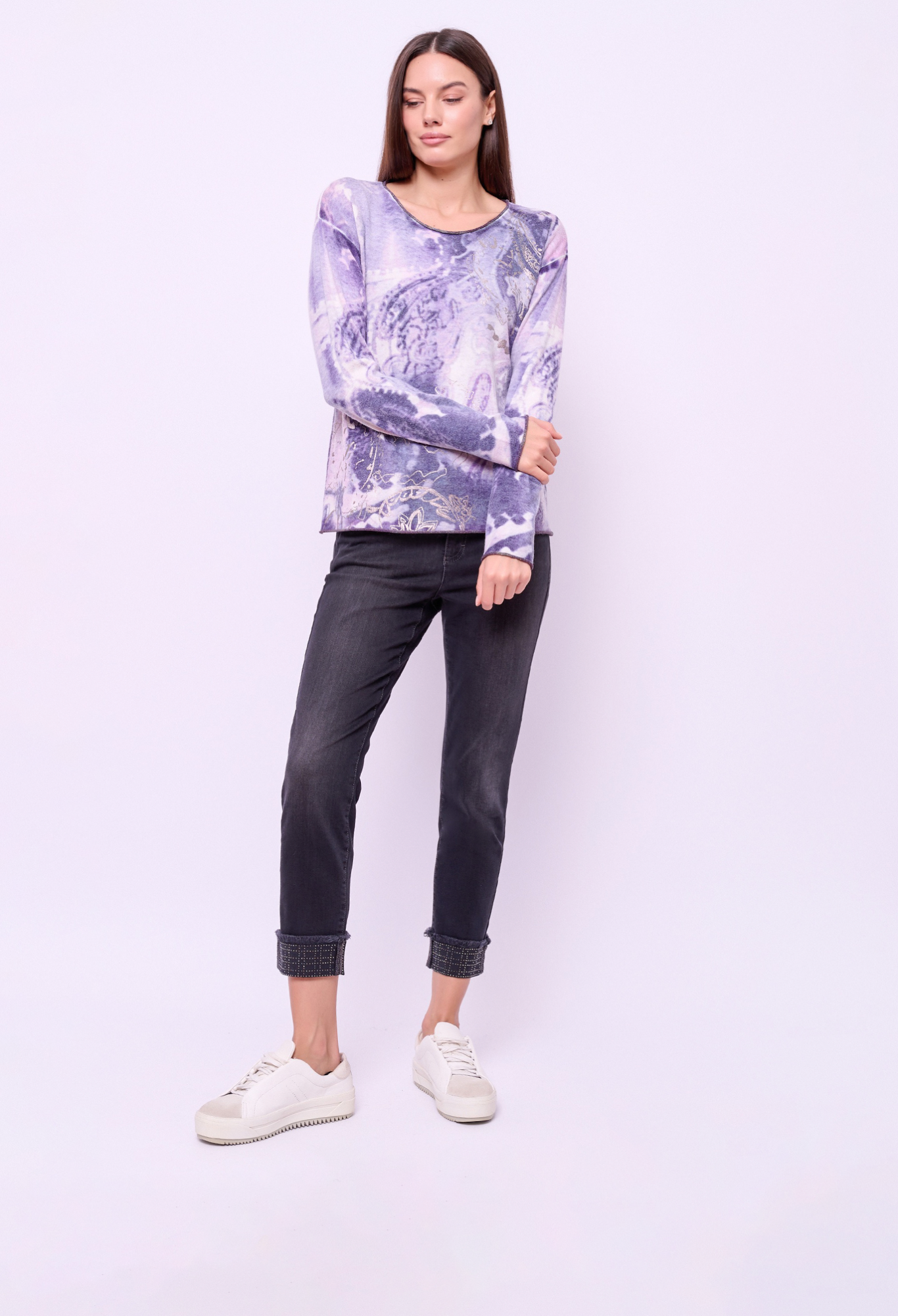 Детали: вырез горловины округлый, рукава длинные, покрой прямой, рисунок абстракция, серебристый принт. Длина по спинке: 58 см.