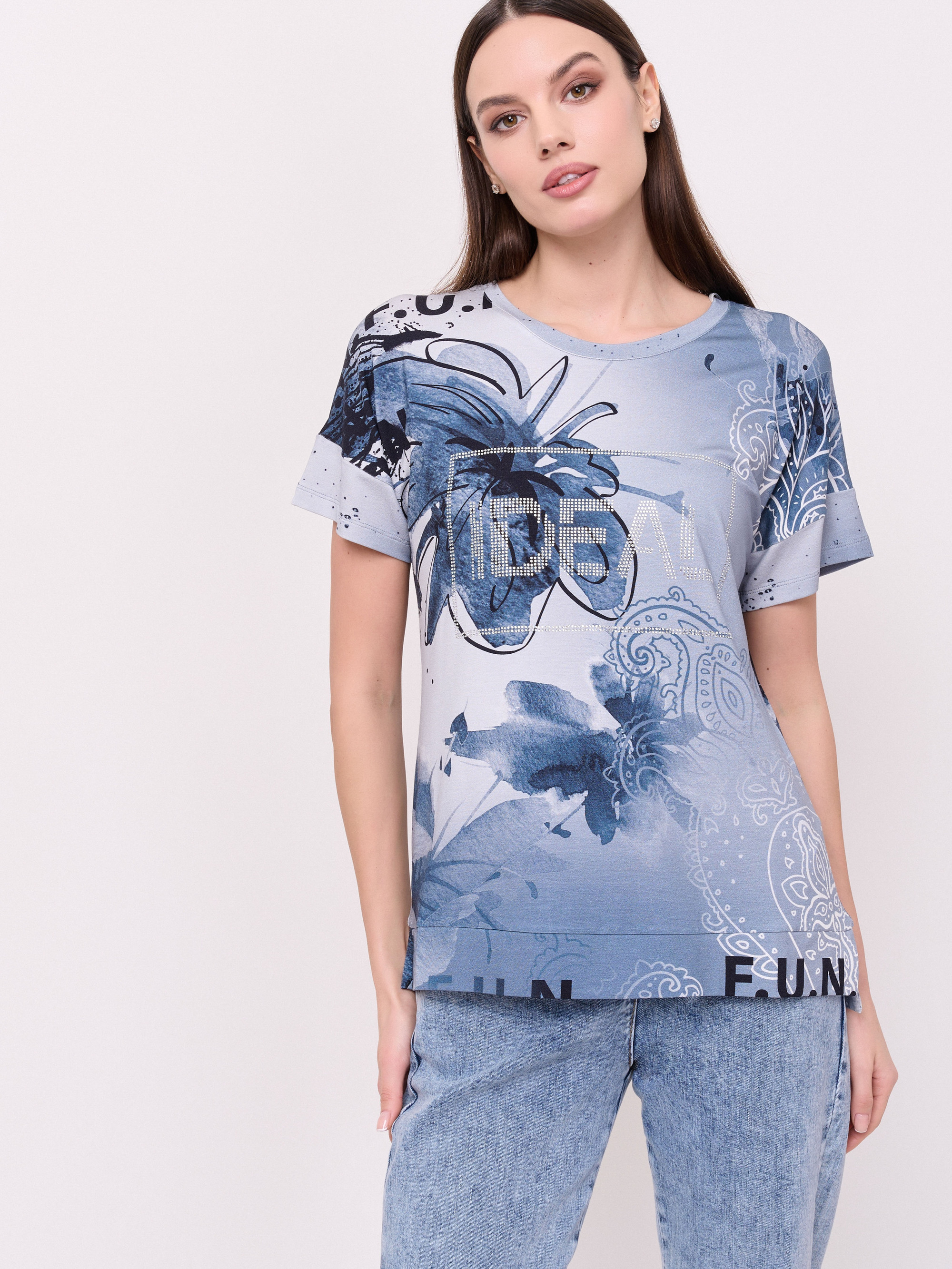 Детали: вырез горловины округлый, рукава короткие, покрой прямой, рисунок цветы и растения, стразы, боковые разрезы. Длина по спинке: 60 см.