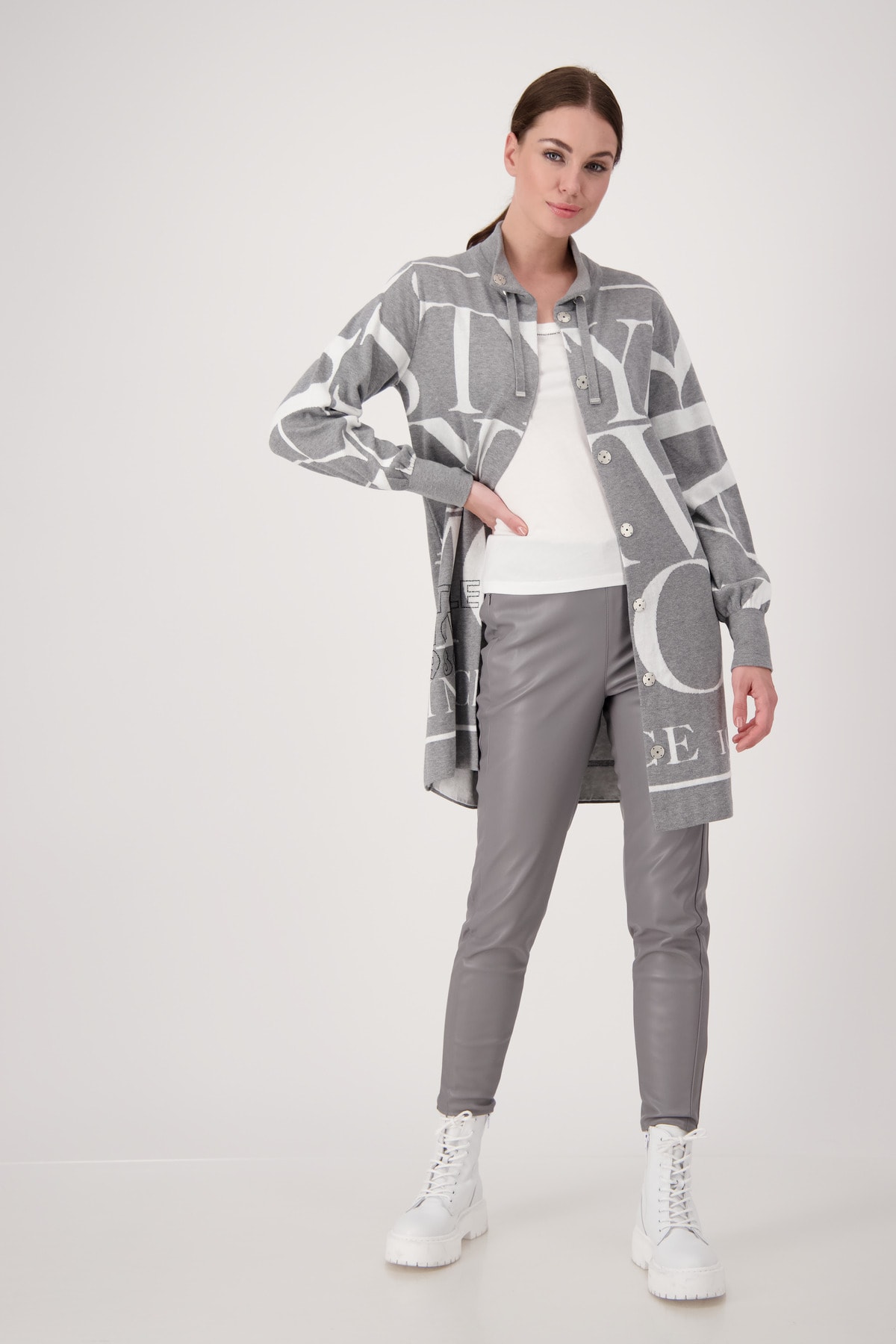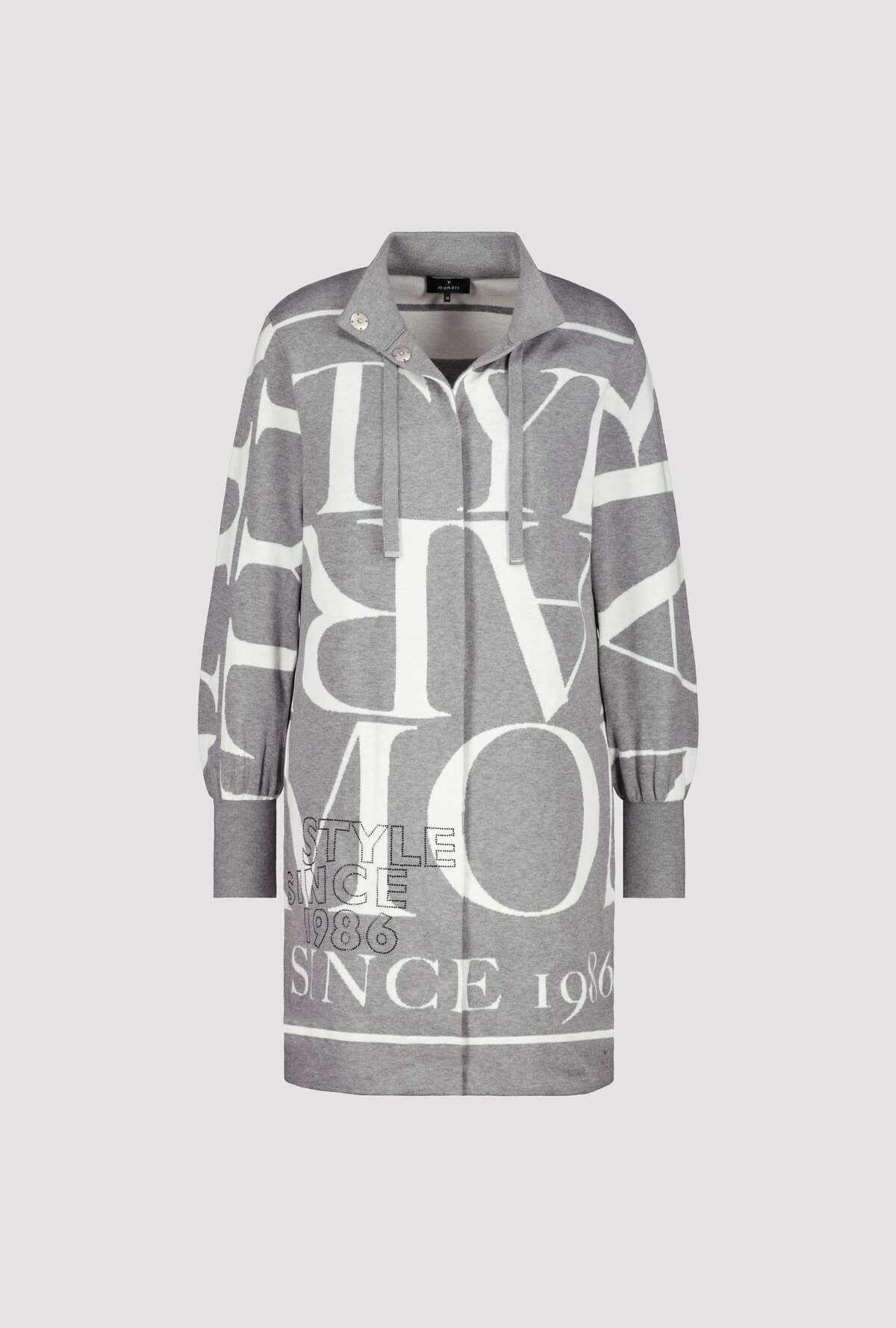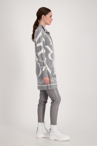 На сайте указаны российские размеры. Жаккардовое вязаный кардиган с воротником-стойкой на пуговицах. Трикотажный кардиган из мягкого качественного хлопка от monari. Повседневная модель с длинными рукавами согреет вас и дополнит любой ваш наряд. Модель с воротником-стойкой и планкой на потайных кнопках. Привлекает внимание: жаккардовая надпись и надпись со сверкающими стразами спереди. Модель ростом 179 см.