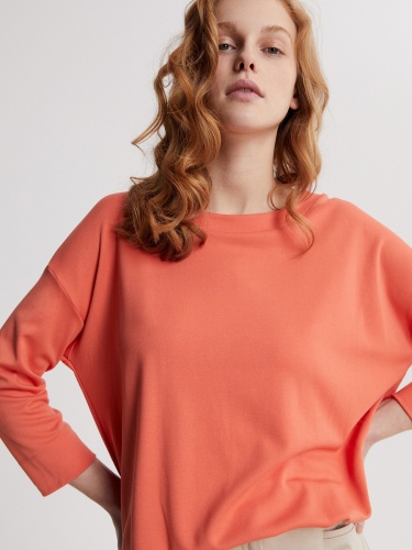 Яркий однотонный джемпер для стильного повседневного образа. Втачной рукав 3/4 со спущенной линией плеча. Овальный вырез горловины. Эластичная лента по низу изделия.
