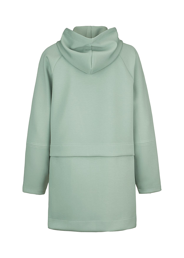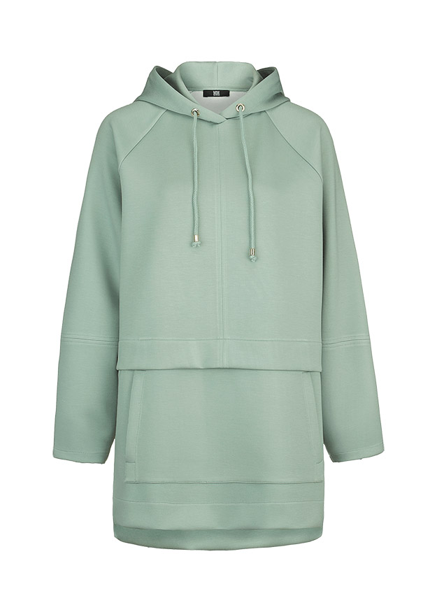 Спортивная модель с капюшоном, кулисками и карманами-кенгуру. На талии горизонтальный шов и боковые вырезы.