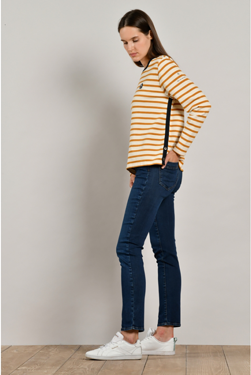 Хлопковый джемпер в полоску, круглая горловина, втачной рукав полной длины. Нашивка на груди в качестве украшения. Горловина и боковой шов украшены контрастной лентой. Отличный вариант для повседневной носки и образов в стиле кэжуал.