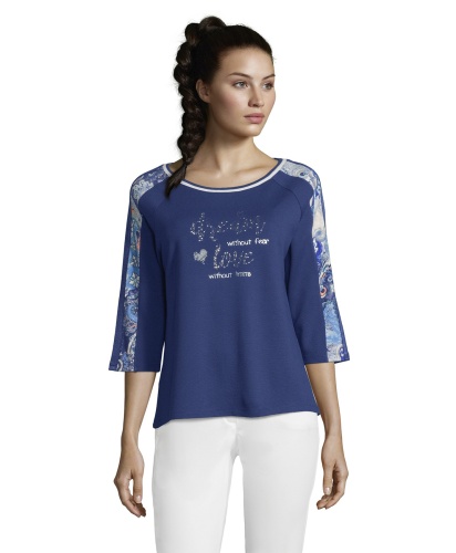 Джемпер прямого покроя создает непринужденный вид. Вырез горловины "лодочка", рукава реглан 3/4. Материал из вискозной смеси обеспечивает комфорт. Детали джемпера - надпись на груди, вставки принтованной ткани на рукавах и контрастная обтачка горловины - обращают на себя внимание и гарантируют стильный облик с любым комплектом одежды.