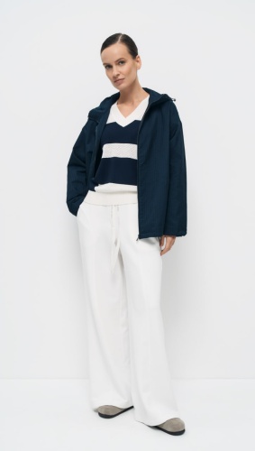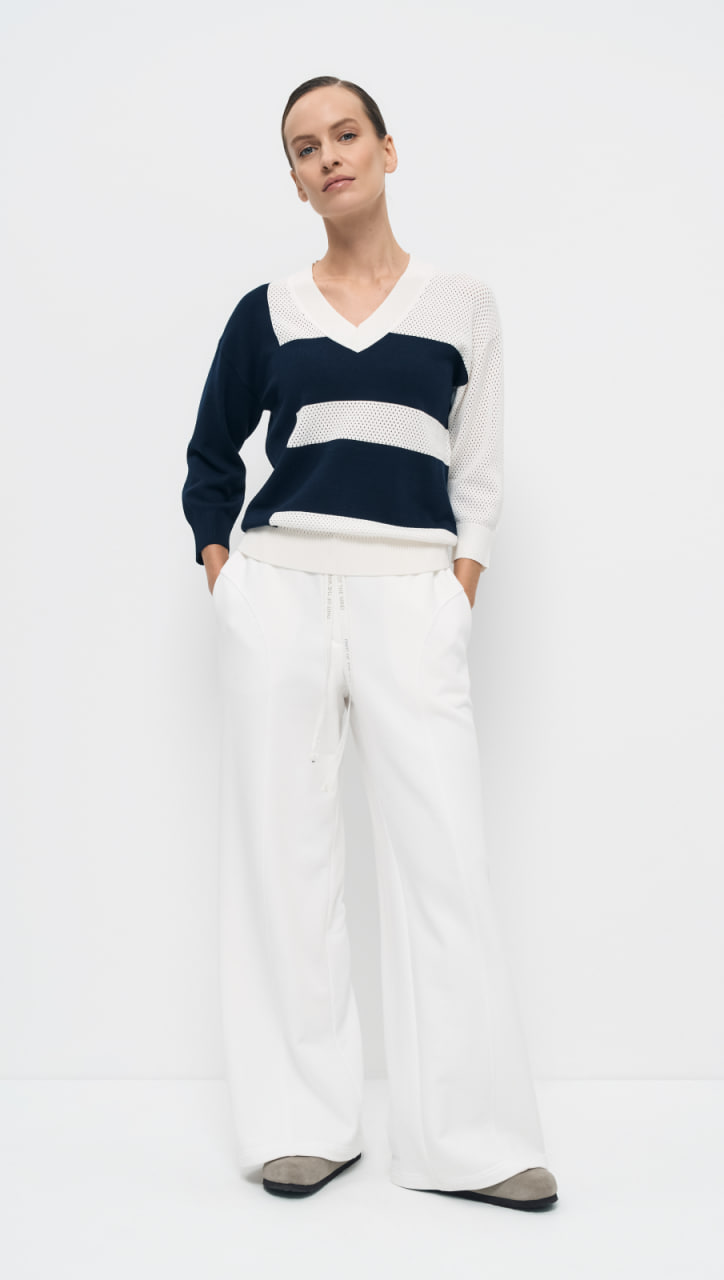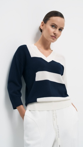 Пуловер прямого силуэта «Черничный пирог» выполнен в интарсионном переплетении, сочетающем ажурную вязку и кулирную гладь, что обеспечивает комфорт и тепло, при этом выглядит стильно и современно. Яркое контрастное сочетание двух цветов ставит акцент в повседневном образе. Рукав прямой, длиной ¾, а горловина имеет V-образную форму, что придаёт изделию элегантный и современный вид.